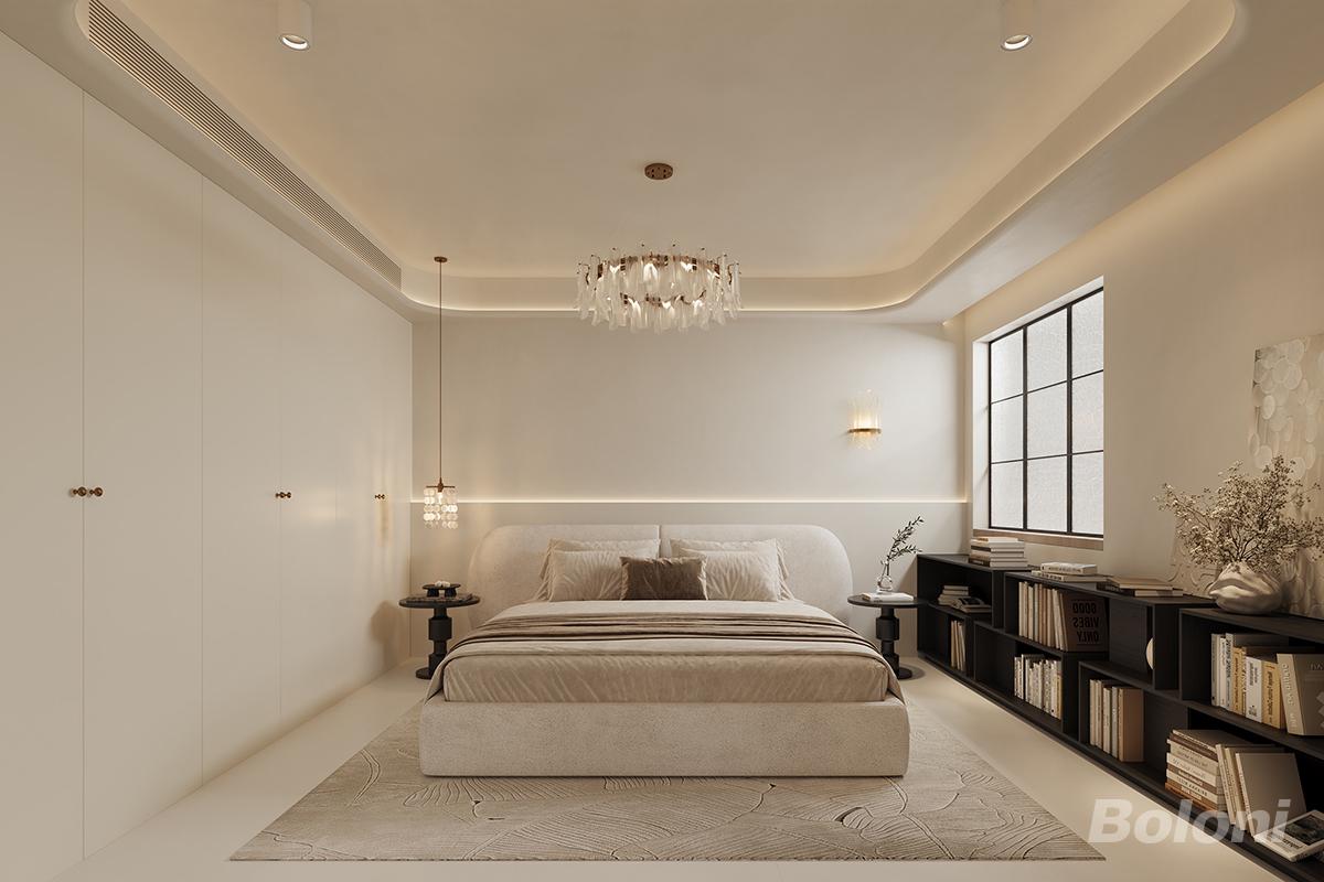 这间卧室以法式奶油风融合轻奢质感的设计,营造出浪漫雅致且舒适静谧的休憩空间。整体以柔和的奶油色系为主调,搭配精致的细节设计,尽显法式浪漫与轻奢格调。弧形床头造型圆润柔和,浅米色床品搭配棕色装饰毯,色彩和谐且富有温馨感,多个抱枕的组合提升了卧床的舒适体验。一侧的黑色床头柜小巧精致,搭配同系列的吊灯,设计感十足;另一侧的黑色开放式书架,摆放着书籍与装饰摆件,为空间注入文化气息与生活质感。