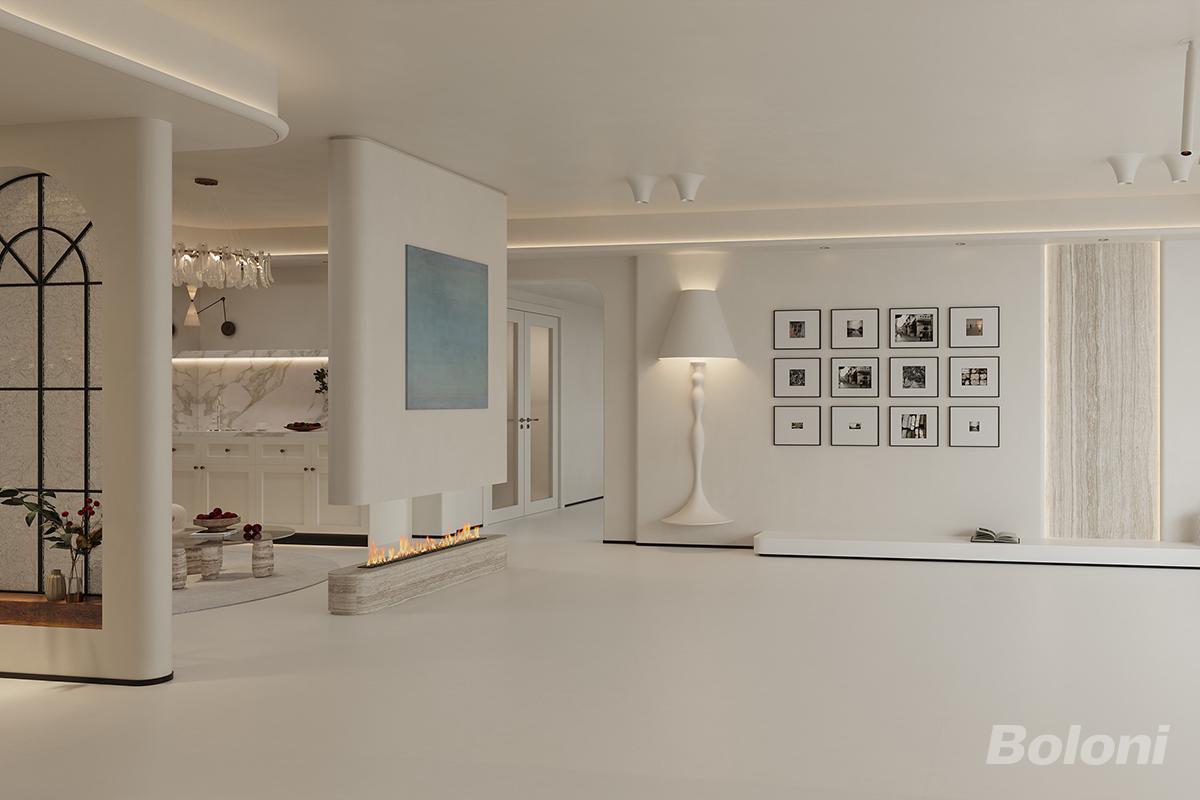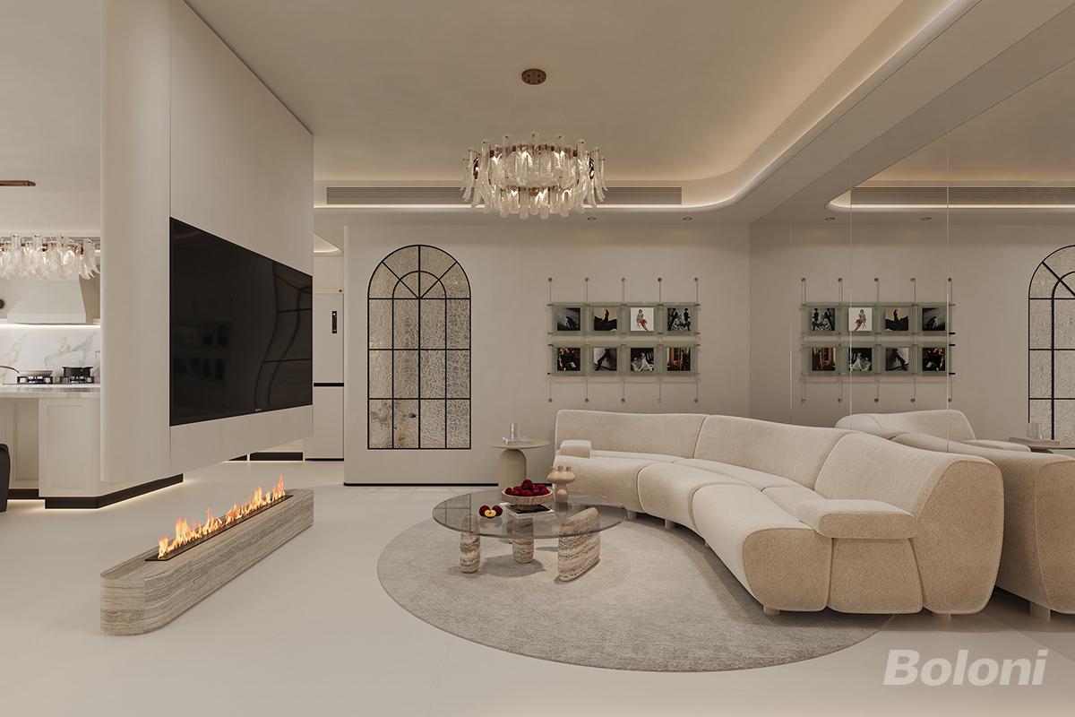 客厅设计极具艺术感,弧形的空间分割元素柔化了空间线条,嵌入式的线性壁炉造型简约,火焰的点缀为空间增添了温暖与格调。墙面的黑白照片墙排列整齐,形成视觉焦点,搭配造型独特的白色落地灯,现代感与艺术感并存。