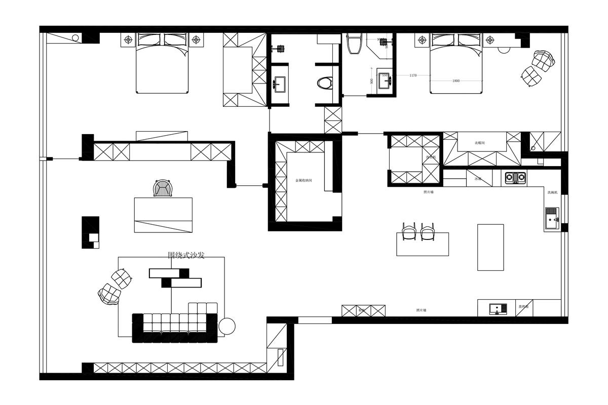 本设计空间分区明晰,双卧室保障私密休憩,客餐厨动线流畅且围绕式沙发强化社交互动;金属收纳间、衣帽间提升储物效率,厨卫布局紧凑实用。整体以简洁线条构建功能与美学兼具的居住场景,于方寸间尽显空间利用的精妙考量。
