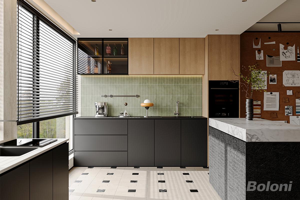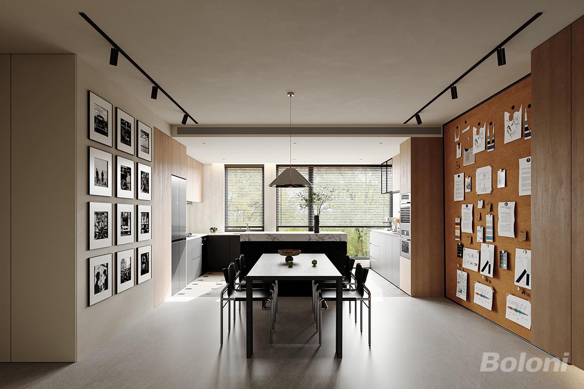 本厨房循包豪斯“形式追功能”之核,以原木、金属、玻璃材质交织,浅绿瓷砖焕活空间。功能布局兼顾收纳与操作,经典灯具与软木展示区相衬,于工业理性中糅合生活美学,尽现包豪斯现代设计的实用与艺术之衡。