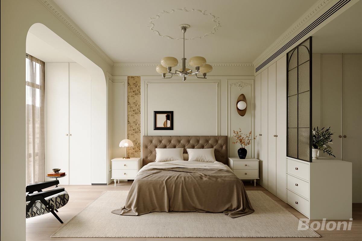 此卧室借现代简约的开阔布局营造空间通透感,复古雕花与球形吊灯点缀轻奢韵味,拱形门洞延展视觉层次。简约柜体与软包床头的碰撞,于舒展格局中平衡实用与雅致,在新旧交融间演绎出质感与诗意共生的人居美学。
