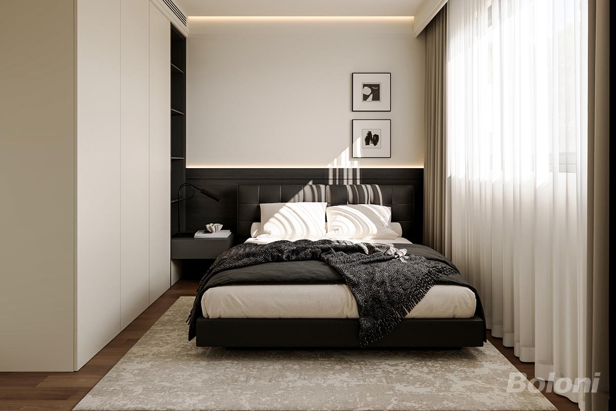 此卧室以现代简约的利落布局拓展空间通透感,复古软包床具与艺术挂画点缀轻奢韵味,黑白灰调与木质地板相融。简约柜体与精致软装碰撞,于通透格局中平衡实用与雅致,在新旧交融间演绎出静谧且具质感的休憩美学。