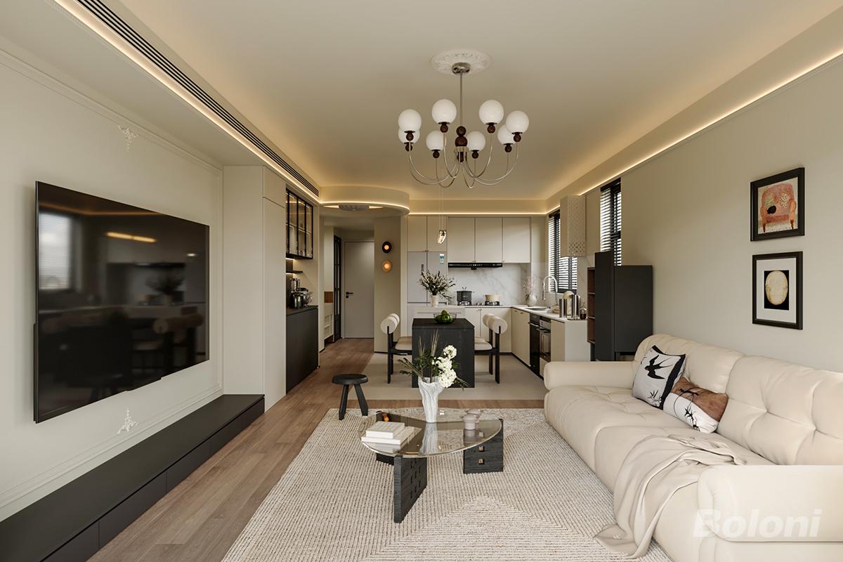 这套设计将现代简约的空间通透感与复古轻奢的精致韵味相融。低饱和色调铺就雅致基底,开放式布局与简洁柜体拓展空间层次,复古球形吊灯、雕花饰线、艺术挂画点睛轻奢质感,材质碰撞间,于舒展格局中平衡实用与雅致,在新旧交融的韵律里,演绎出兼具现代舒适与复古格调的人居美学。