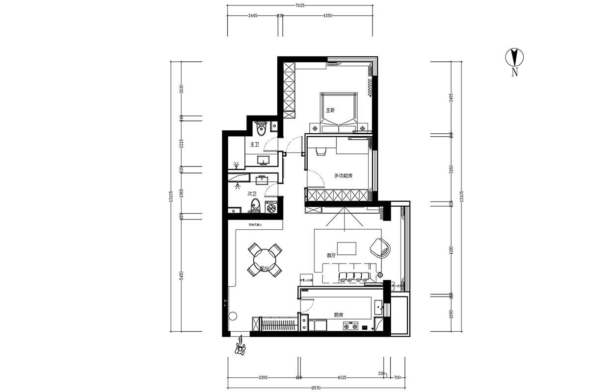 户型上为两居两厅一厨两卫,因为近几年都是常住两人,所以另一居室先作为多功能房使用,现在可以好好使用享受生活,后期再改为居室使用。