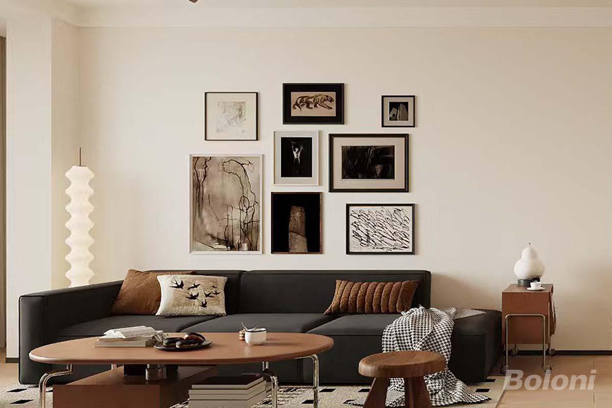 客厅的沙发采用黑色皮质材质,整体上风格为中古风格,与客厅的地毯相呼应,地面用了地板的设置,墙面的色漆采用暖色调。