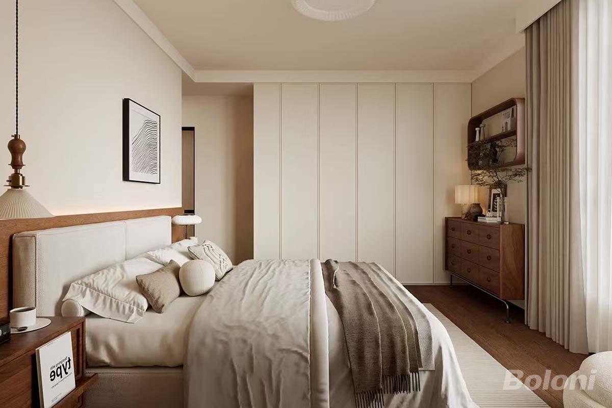 主卧顶面上有一小部分边吊,大部分保持原顶高度避免空间压抑。墙体立面有背景墙加灯带的设计,补充灯源的同时增添设计感。