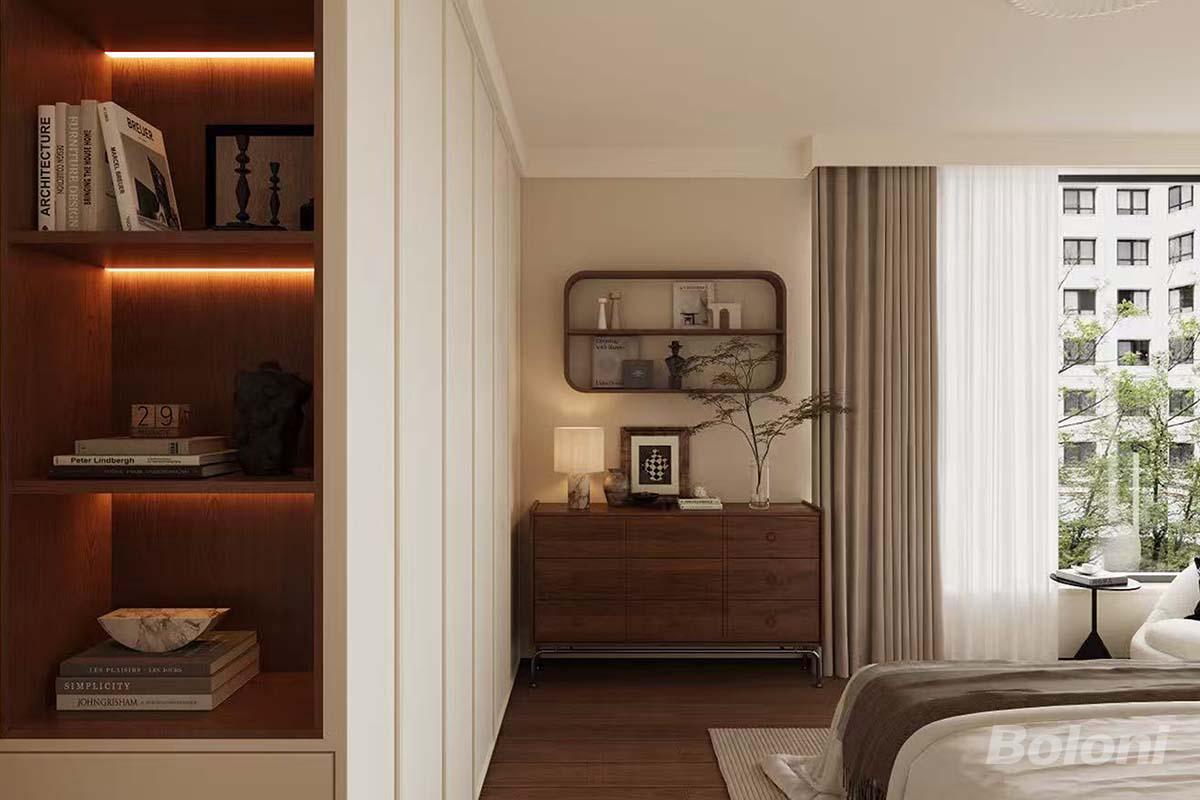 卧室一进门的位置为了避免拥堵,做了深度350的开放格加灯带的设计。床下方有很大空间,所以放置了休闲椅可以更好的享受生活。