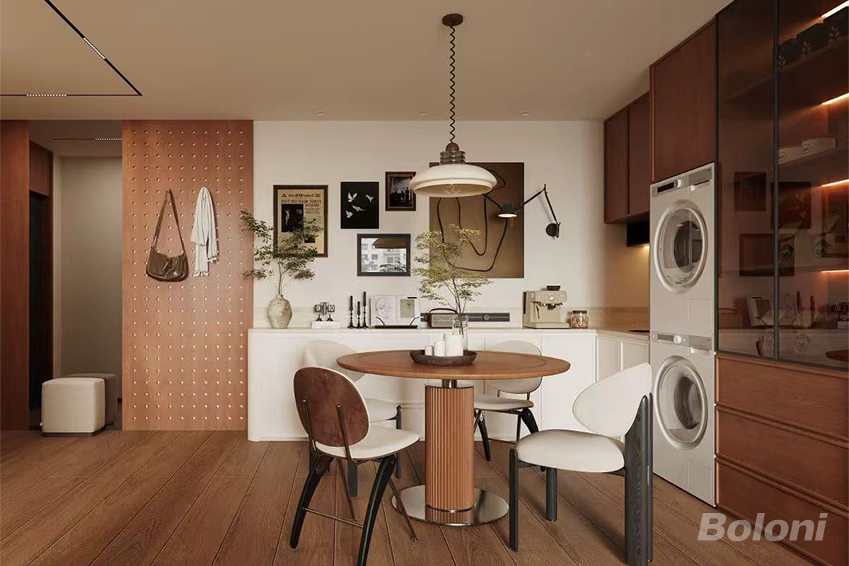 餐厅用了圆桌,弱化了强硬的棱角感。一进门的位置因为空间不够放鞋柜宽度,所以放置了穿衣镜和洞洞板的设计,可以更好的利用空间。