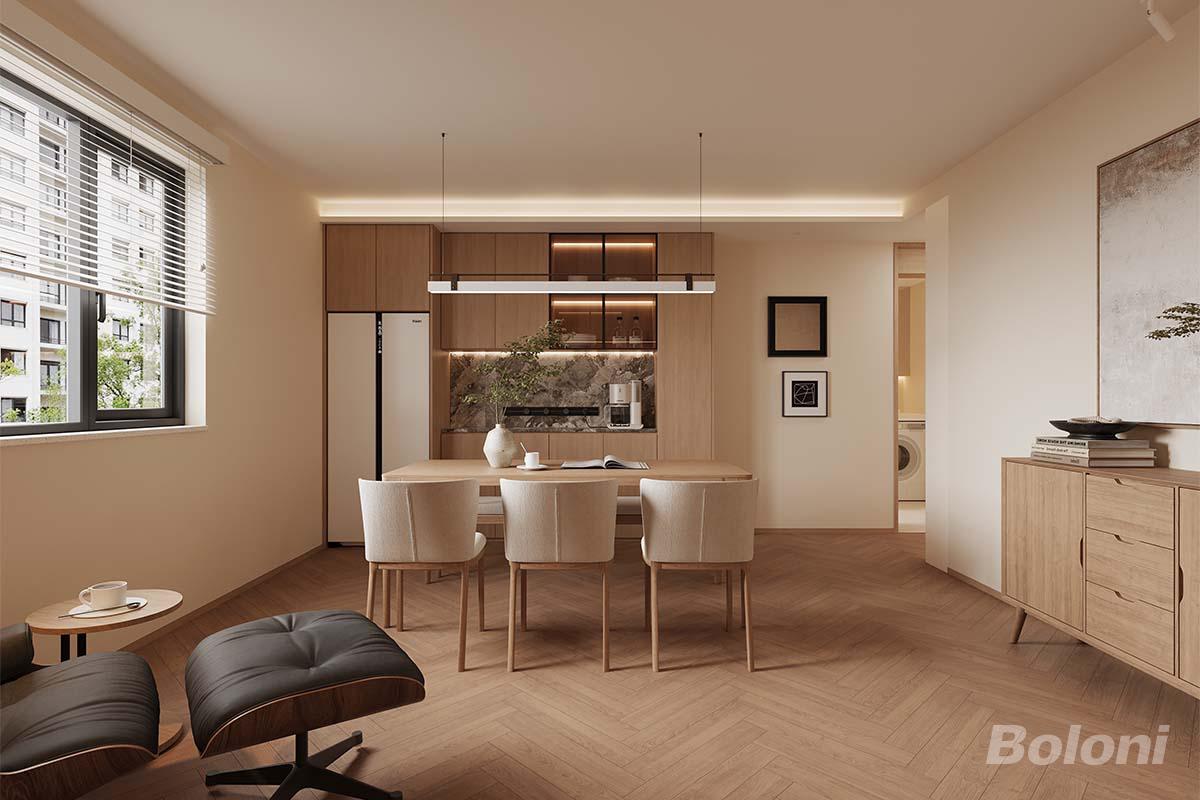 客厅正面做了一组餐边柜,嵌入冰箱,增加了操作空间,解决了厨房空间太小的问题。整体地面采用人字拼地板的设计,与整体原木风相呼应。