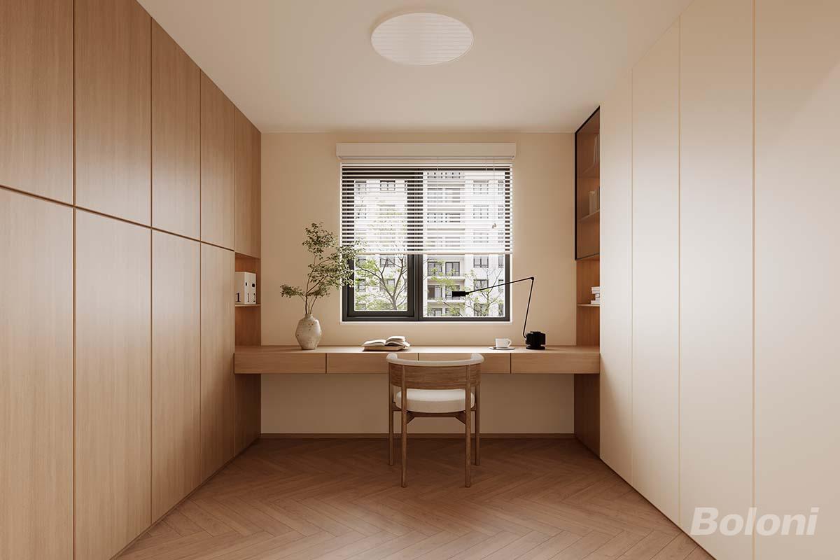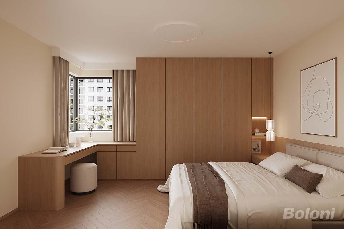 卧室地面上跟客厅相统一采用人字拼地板。L型书桌增加写字空间。立面上采用与衣柜相同色彩的木板为装饰相呼应。