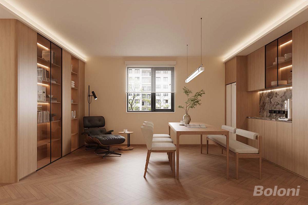 餐厅背面做了一组书柜,加上跳玻璃柜门灯带的设计避免空间上太过压抑。去沙发的设计使空间上更加开阔,视线更明亮。