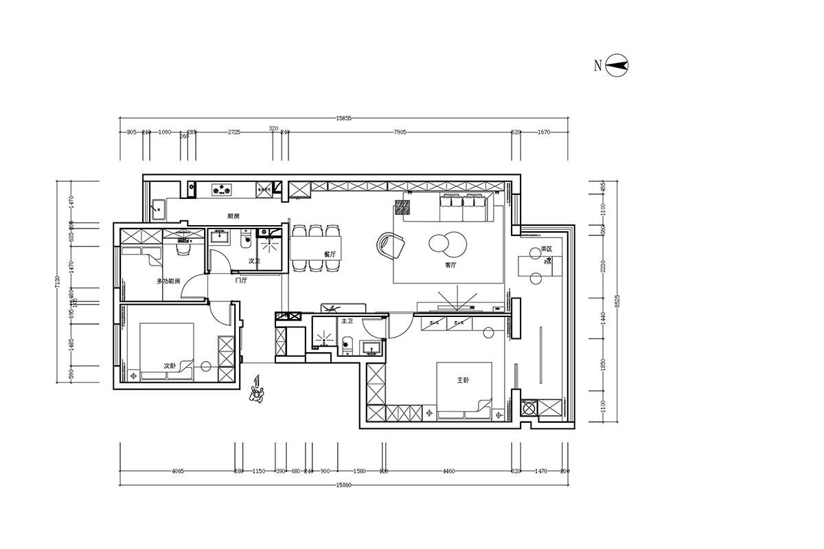 户型为三居一厨两卫两厅,整体风格为意式轻奢风格,立面上采用边吊的设计避免太低使空间太过压抑。无主灯的设计使空间更简约明亮。