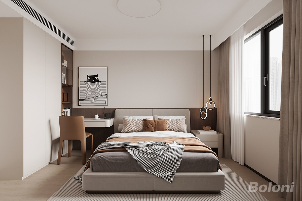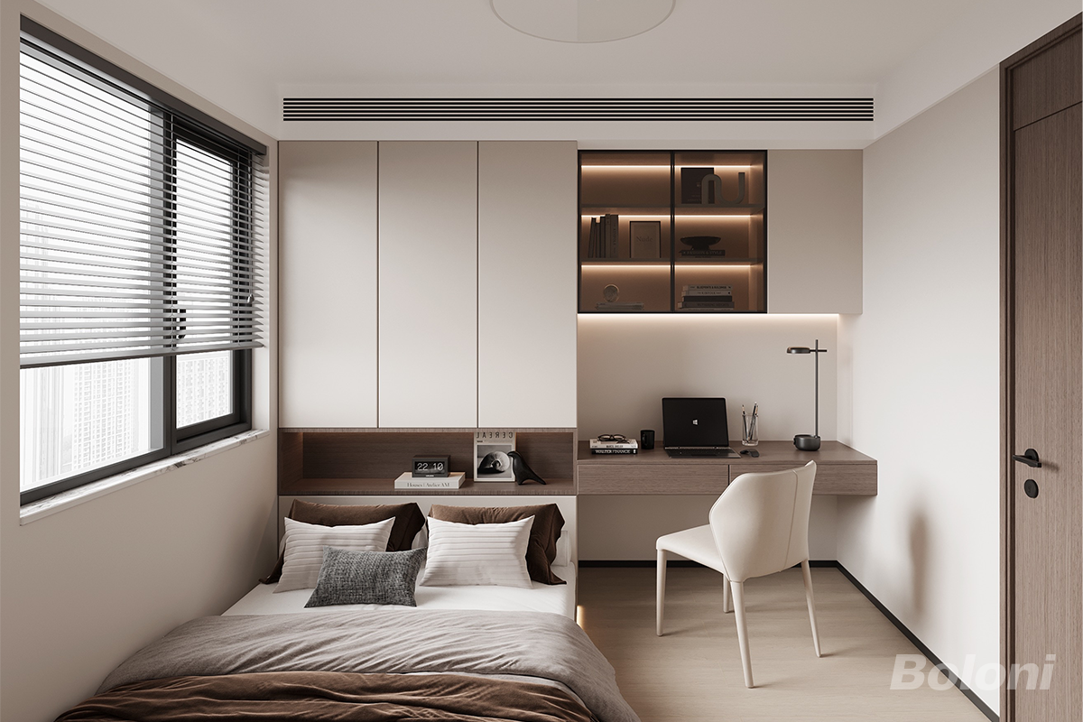 次卧采用边吊的形式,避免压低层高使人感觉压抑。衣柜链接书桌和背景墙的设计既节省了空间的同时也使整体上有关联。