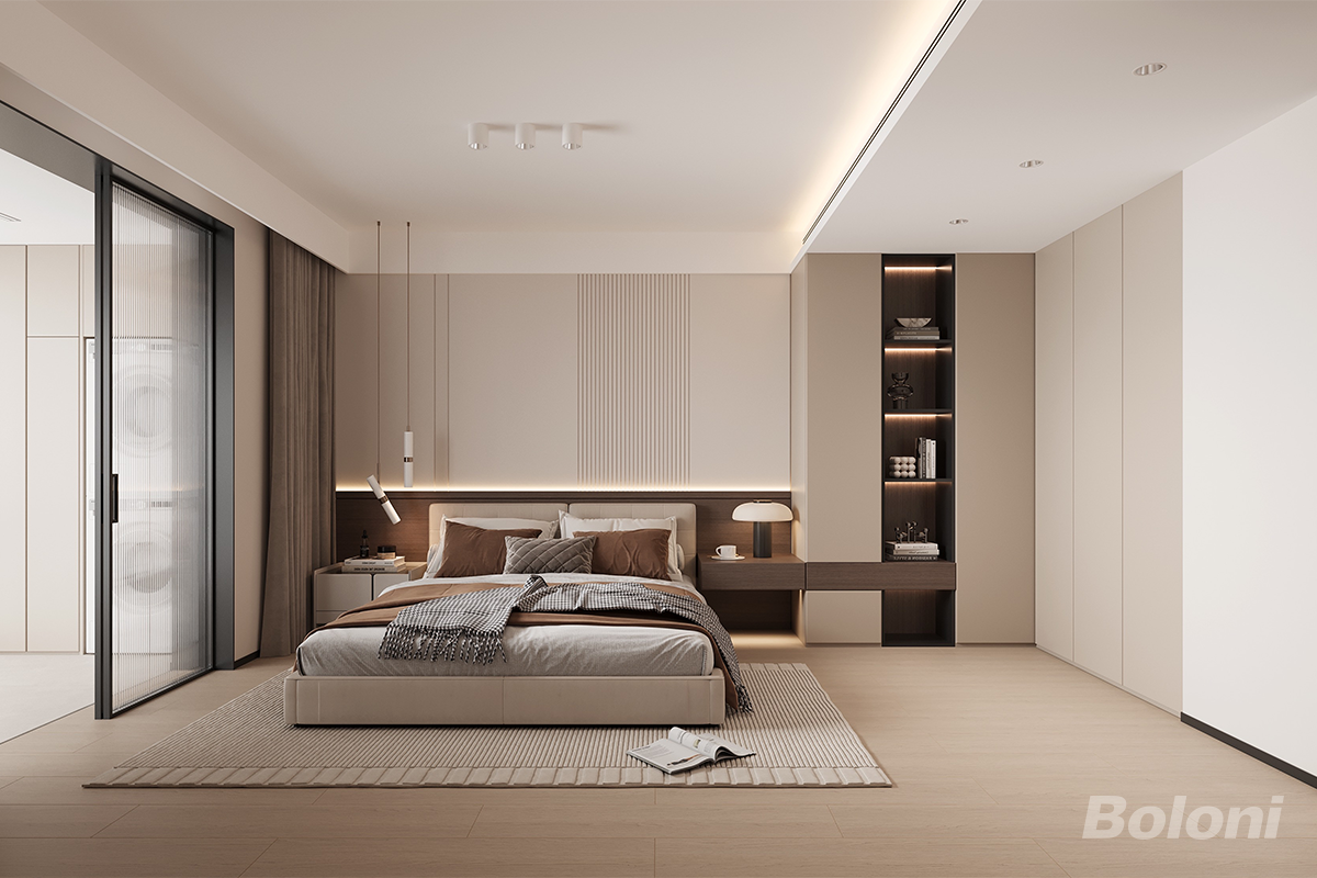 主卧做了L型衣柜的设计,很好的利用空间。背景墙加灯带的设计使立面上更有层次,同时补充了光源,立面上的边吊避免空间压抑。