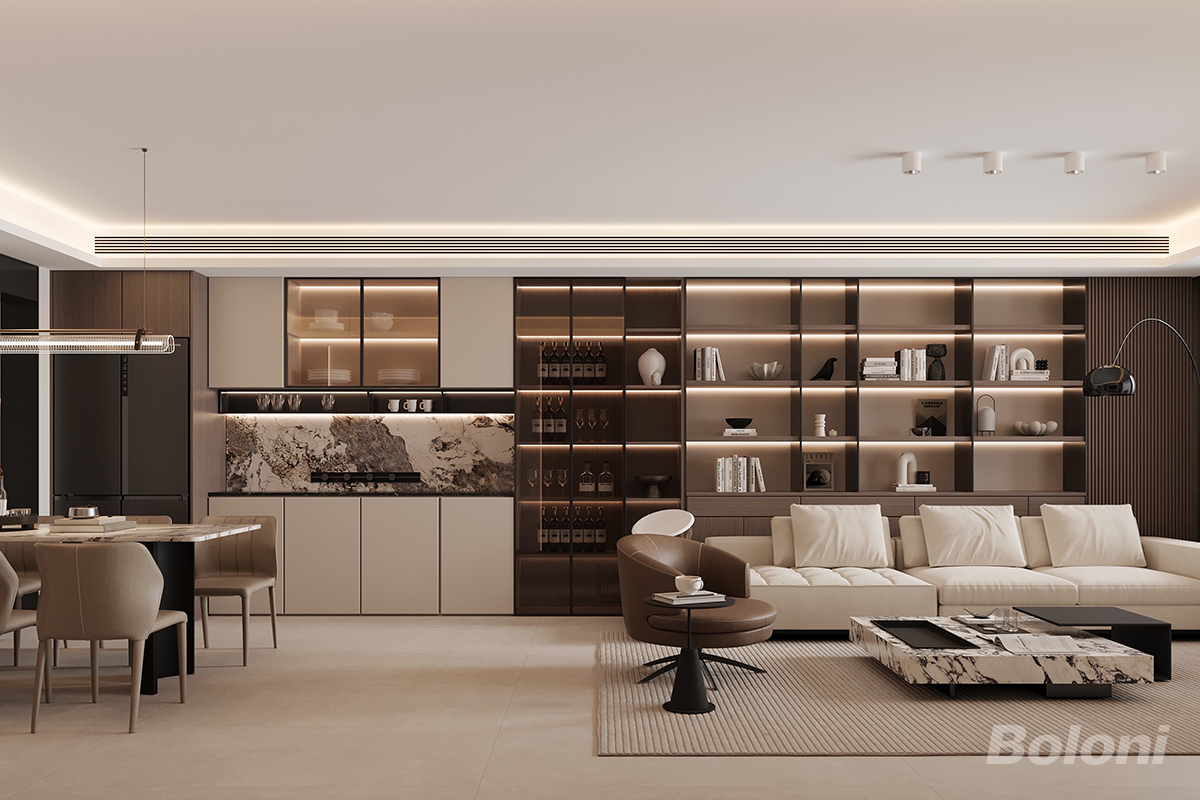 客厅背面的沙发背柜链接西厨台面和冰箱,补充了厨房的操作空间。跳色的设计和玻璃柜门加灯带设计避免了空间太过压抑。
