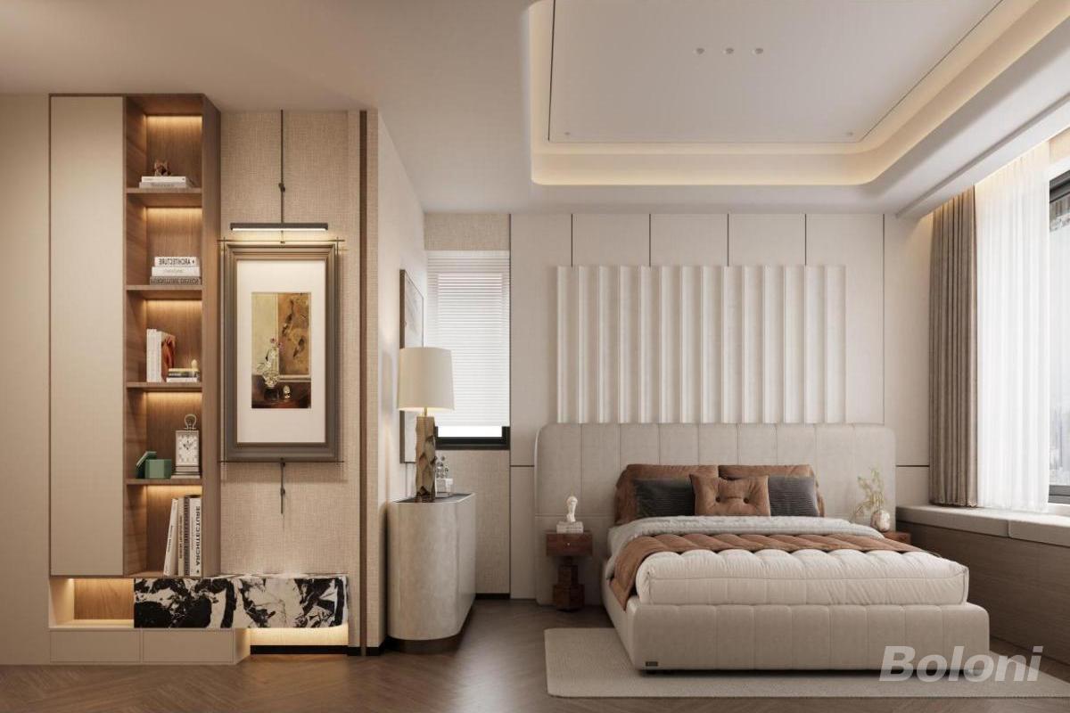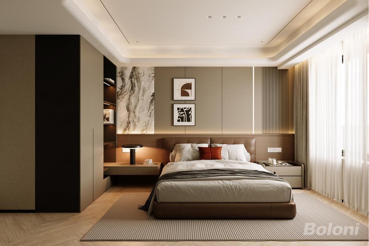 本卧室设计融合现代轻奢与艺术感,暖棕主调搭配大理石、木质元素。嵌入式收纳与功能区一体化设计,艺术挂画、暗藏灯带提升层次,通过材质碰撞与细节雕琢,营造出雅致舒适、兼具格调的休憩空间。