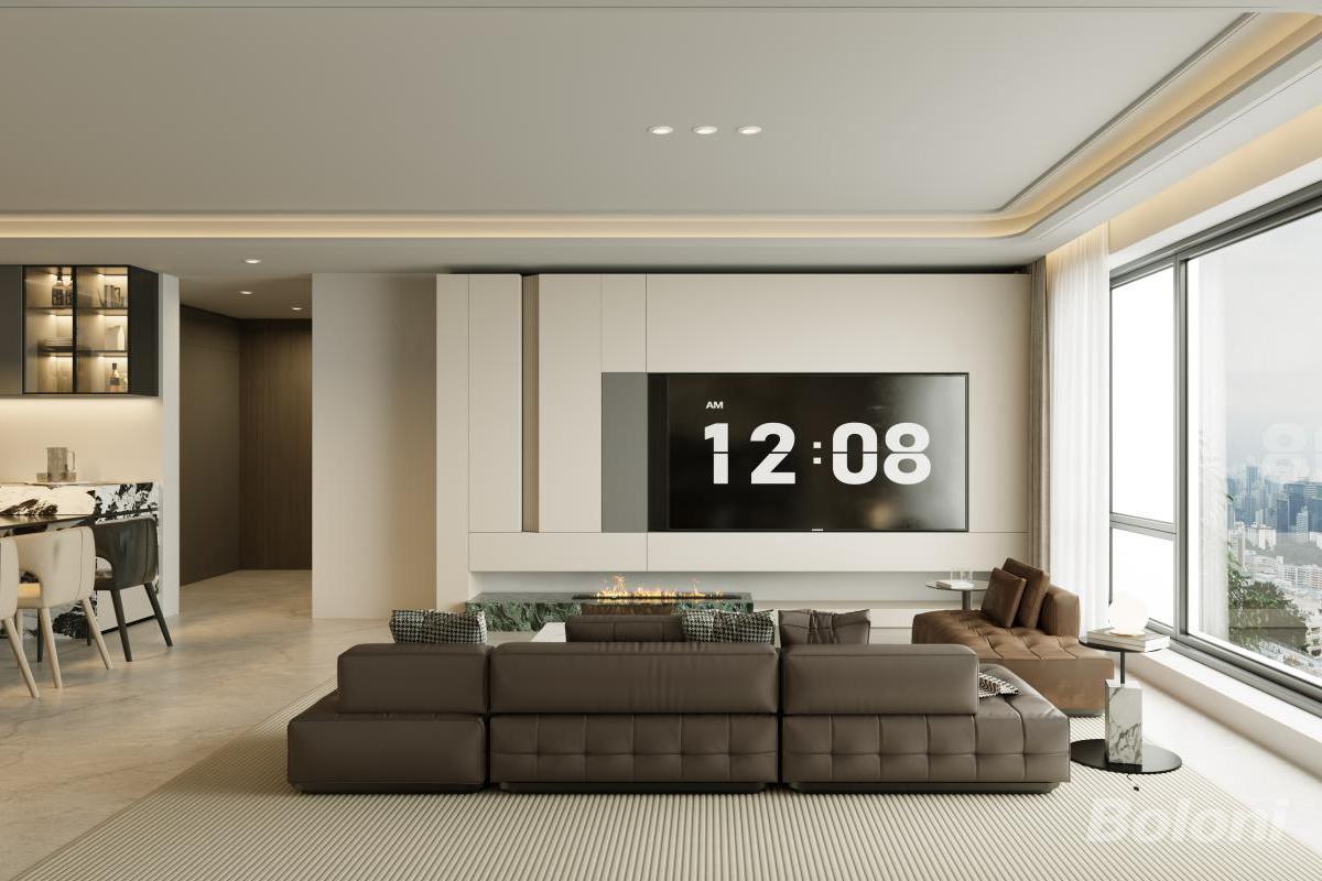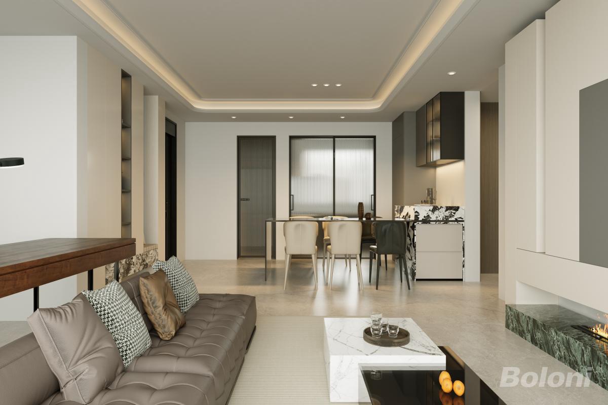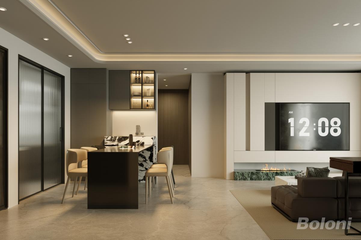 本设计为现代都市居所,以中性色调构建雅致空间。开放式布局串联餐厨与起居,暗藏灯带与精致柜体提升层次,大理石、皮革材质尽显质感,大窗引入城市景观,壁炉增添暖意,实现功能与美学的高阶平衡。