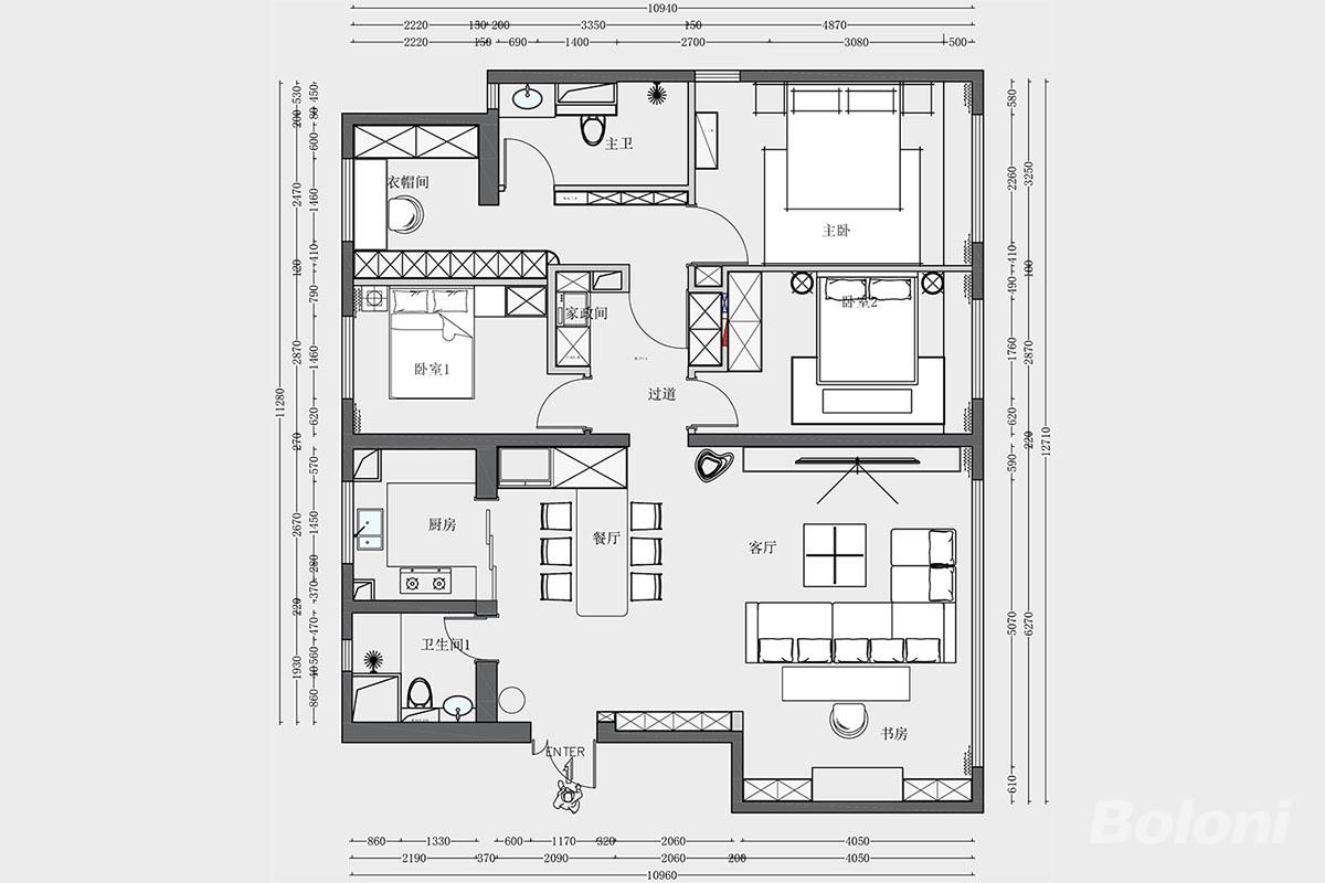 本户型设计采用现代功能型布局,动静分区清晰。餐厨客一体化增强空间通透感,主卧配衣帽间与主卫提升私密性,书房可灵活转换功能。通过合理动线规划与空间利用,打造舒适且具实用性的品质居所。