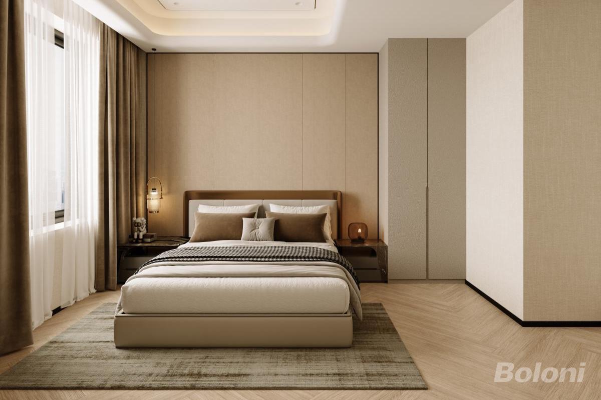 本卧室设计以现代轻奢风格营造静谧休憩空间,暖棕色调搭配布艺与木质元素,层次丰富。暗藏灯带的吊顶与定制柜体,既保证功能实用性,又通过材质质感与细节设计,打造出舒适雅致的睡眠场景。