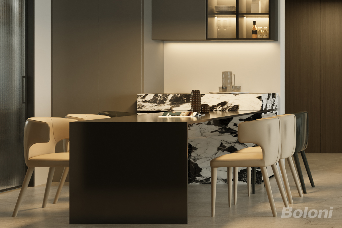 本餐厨区设计以现代轻奢为风格导向,黑色吧台与黑白大理石纹理碰撞出强烈视觉张力,米色餐椅柔化空间。玻璃吊柜搭配暗藏灯带,既展示精致餐具又营造温馨氛围,实现功能与美学的精致融合。