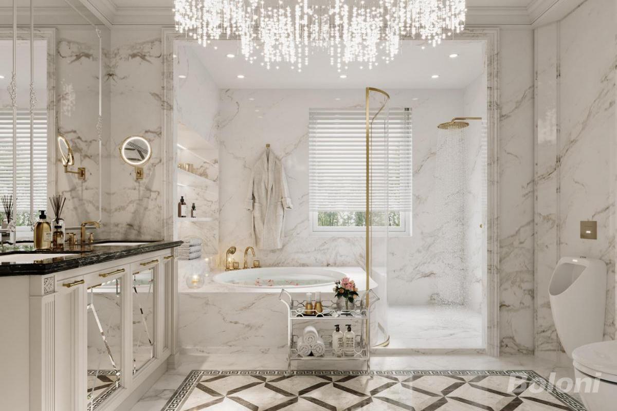 本浴室采用法式轻奢风格,通体大理石塑造奢华质感,水晶吊灯点亮空间。黑金配金饰细节尽显精致,功能分区明确,浴缸与淋浴区兼顾舒适与仪式感,花艺、浴袍等软装营造酒店式奢享氛围,打造优雅疗愈的卫浴空间