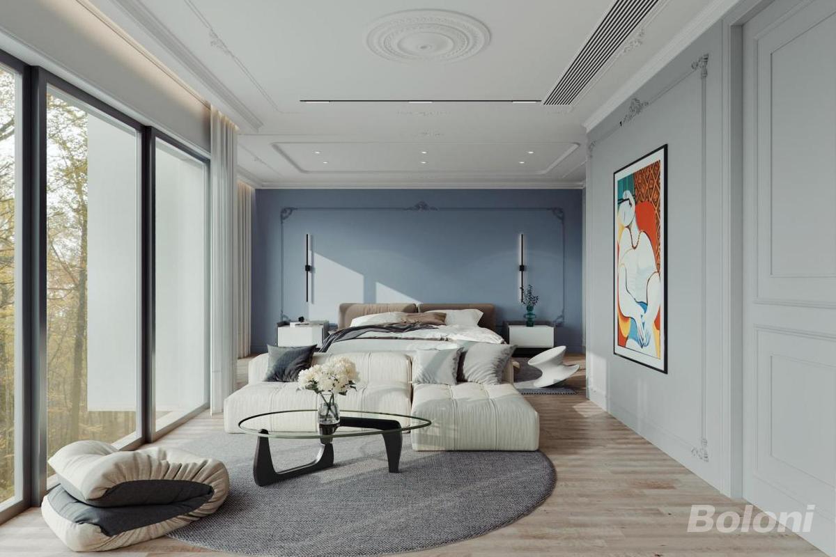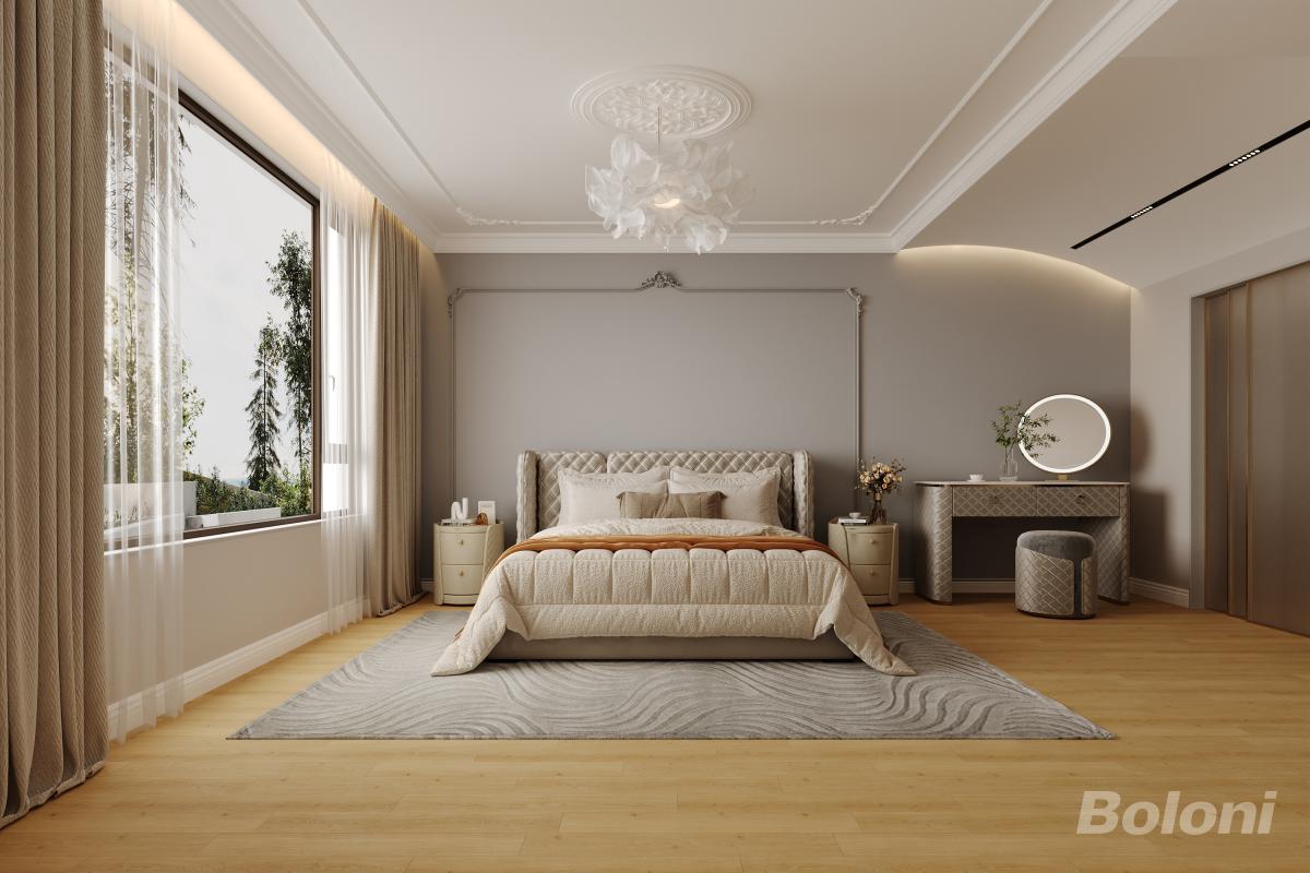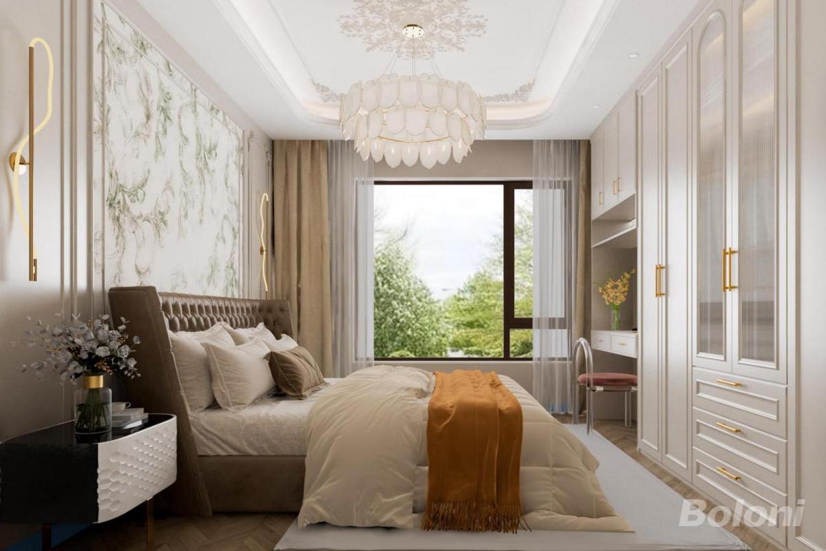 本卧室以法式轻奢风格打造,浅灰墙面搭配雕花吊顶、艺术吊灯,营造雅致氛围。木质地板与柔暖布艺床具传递温馨,大窗引景入室,梳妆台细节尽显精致,在复古与现代间平衡,成就舒适且具格调的休憩空间。