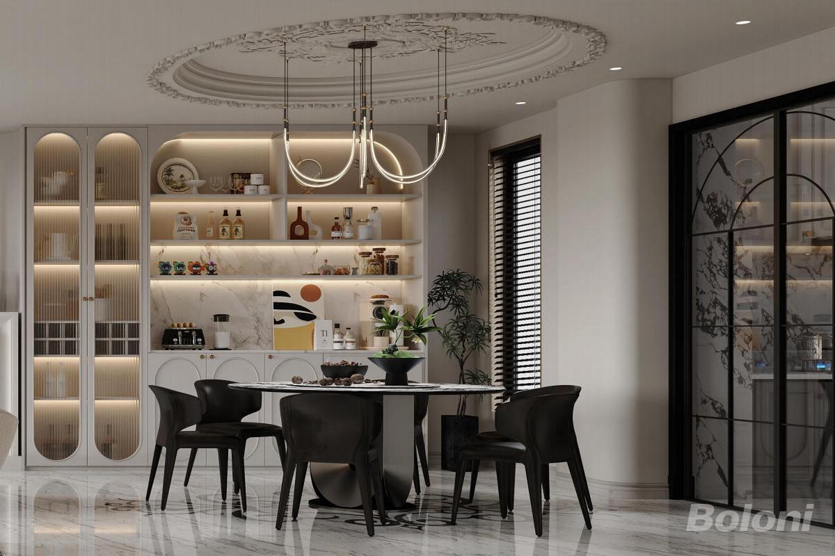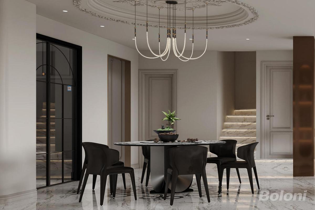 本设计为法式轻奢风格,以优雅米白为主调,通过雕花墙面、水晶吊灯呈现法式浪漫,搭配大理石与金属元素提升质感。开放式布局融合起居与餐厨,精致软装与自然光线交织,打造奢华且具艺术感的生活空间。