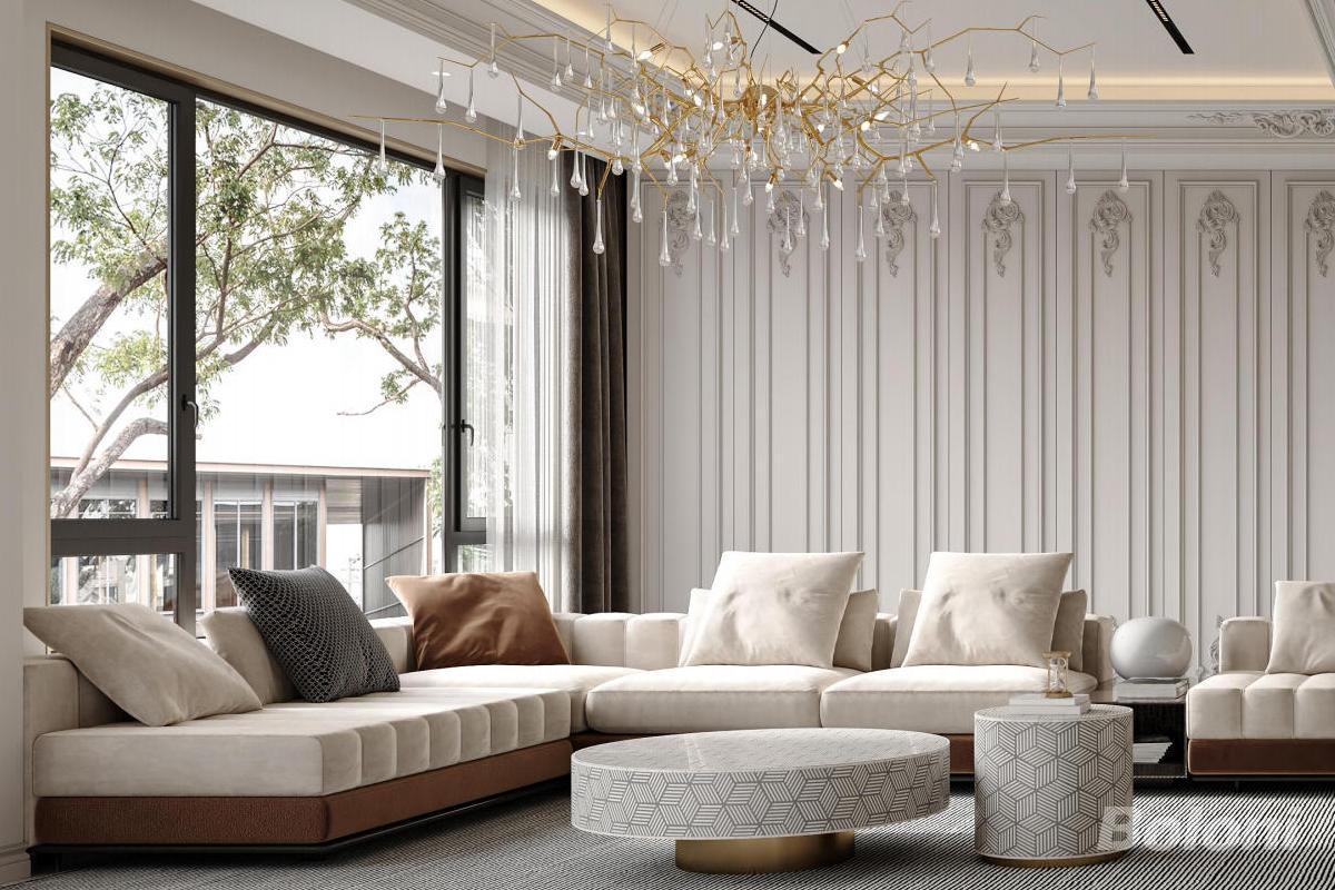 本客厅设计为法式轻奢风格,以米白、暖棕为主调营造雅致氛围。艺术感吊灯如树枝垂晶,精致墙板添细节,大窗引景入室。模块化沙发与几何纹理家具,在舒适中尽显奢华质感,打造兼具格调与温度的社交空间。