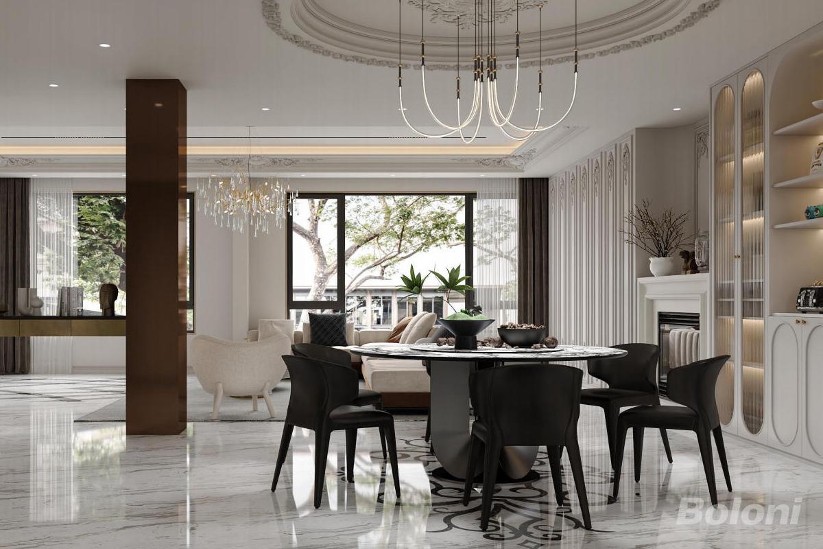 本客厅采用法式轻奢风格,大理石地面与精致墙板奠定优雅基调,艺术感吊灯如金色枝蔓垂晶,点亮空间。米白绒面沙发搭配几何摆件,大窗引景入室,在复古细节与现代舒适间平衡,打造兼具格调与温度的社交场域。