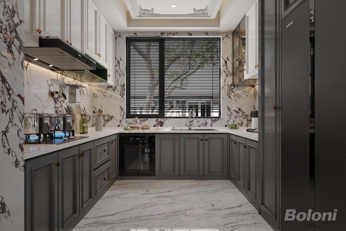 本厨房采用法式轻奢风格,大理石纹理墙面与地面塑造奢华质感,灰白橱柜搭配金属拉手尽显精致。大窗配百叶帘引入自然光线,嵌入式厨电优化功能布局,在复古细节与现代实用间达成平衡,打造优雅且高效的烹饪空间。