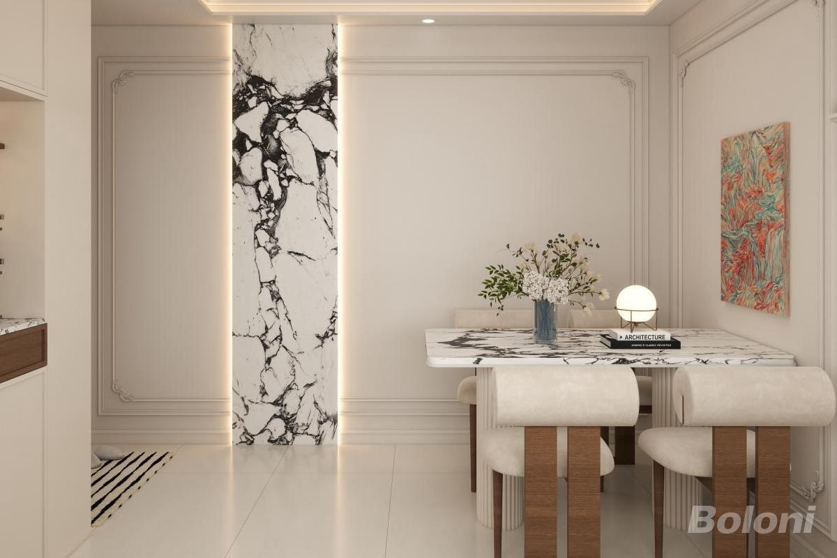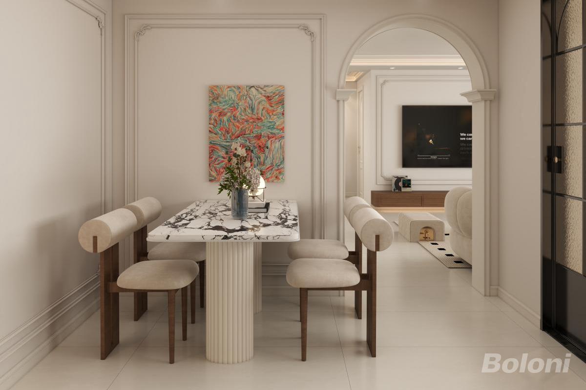 本案为法式现代风格餐厅,以浅白为底,借拱形门洞串联空间。大理石餐桌搭配绒面餐椅,艺术挂画与花艺点缀,融合精致线条与柔和材质,营造优雅且具生活温度的用餐氛围。