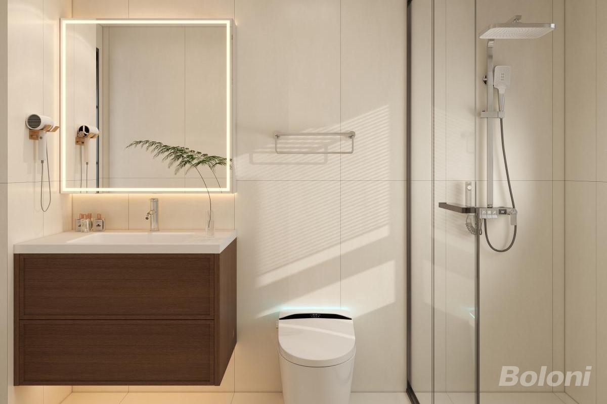 本案为现代简约风卫浴,以浅米色为主色调,悬浮木柜增添轻盈感,智能镜带氛围光。绿植点缀生机,功能分区清晰,融合实用与美学,打造整洁、舒适且具精致细节的洗漱空间。