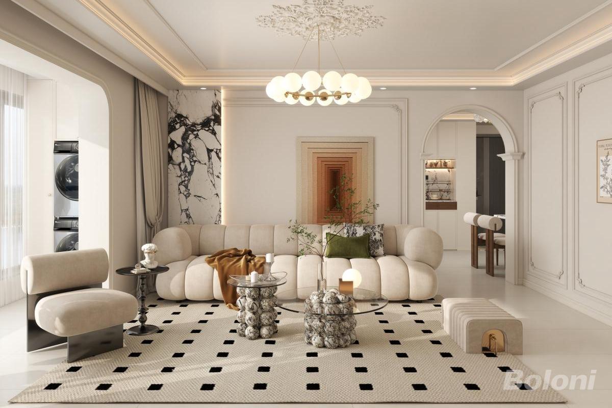 本案为法式现代客厅,以奶油白为主调,借石膏线、拱形门洞营造优雅轮廓。大理石墙、球形吊灯添精致,圆弧沙发融合自然纹理,搭配艺术陈设,平衡浪漫与实用,诠释慵懒法式生活。