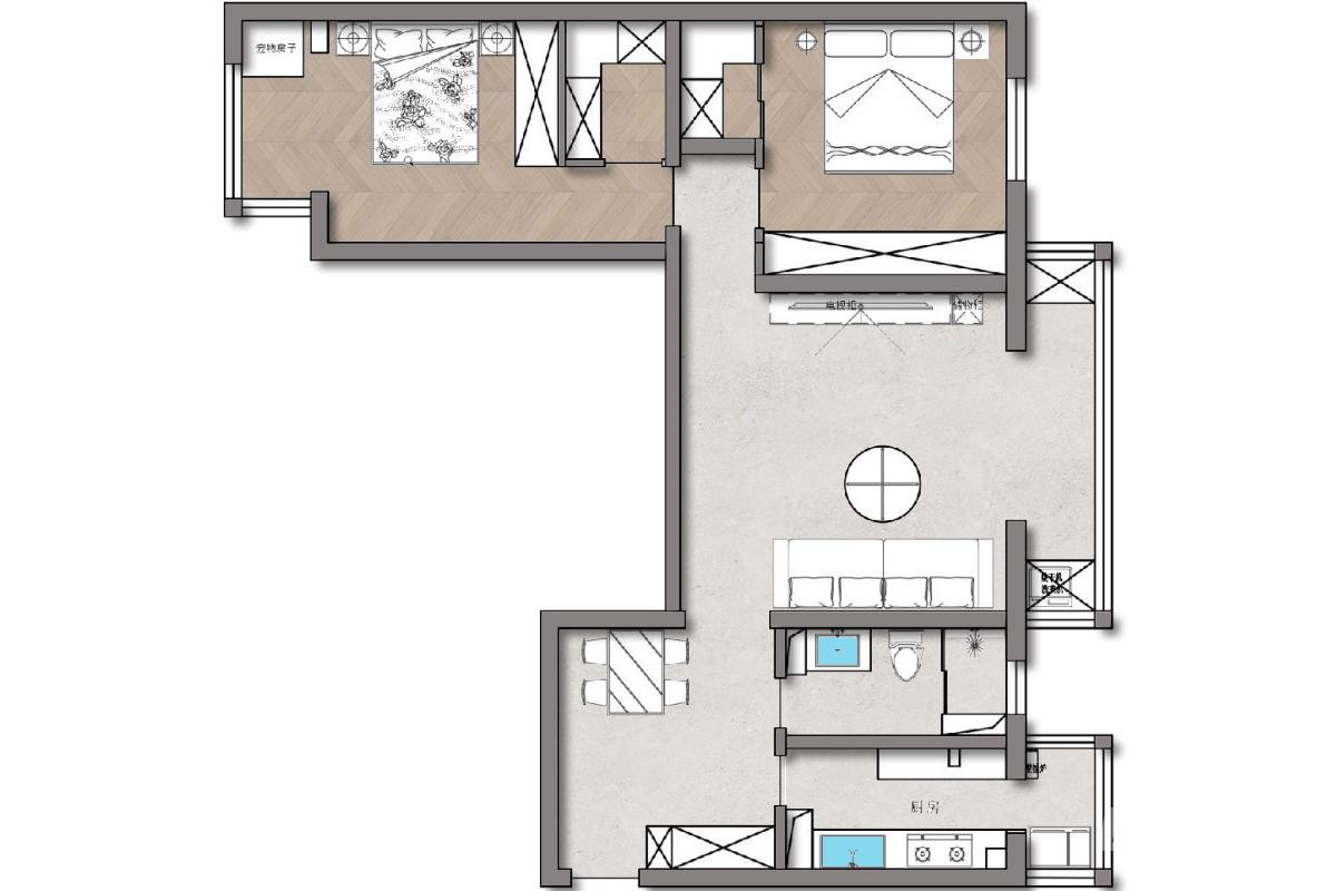 本案为法式现代风,布局开放流畅,客厅圆形元素呼应浪漫。色彩取低饱和调,材质融合原木与金属。卧室保留法式优雅,厨卫功能清晰,以简约线条勾勒慵懒精致的生活场景。
