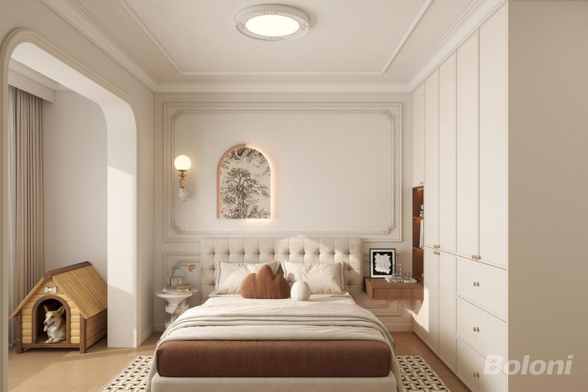 本案为法式现代风卧室,浅色调打底,石膏线勾勒精致轮廓。拱形元素、壁灯与装饰画营造浪漫,软包床头、温润木色添温馨,嵌入式柜体兼顾收纳,打造优雅舒适的休憩空间。
