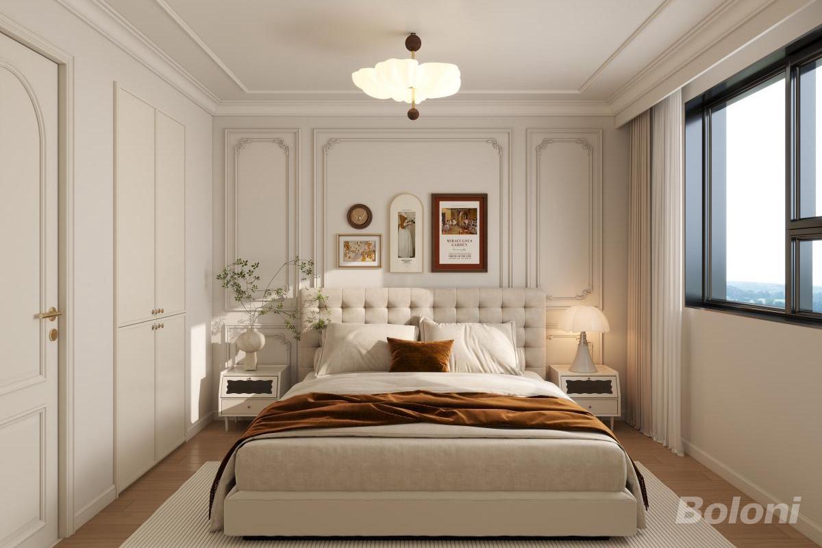 本卧室融合法式优雅与现代简约,以白色为主调,石膏线勾勒精致,搭配软包床头、复古挂画,暖棕床品点缀,借自然采光营造温馨静谧、兼具浪漫格调的休憩空间。