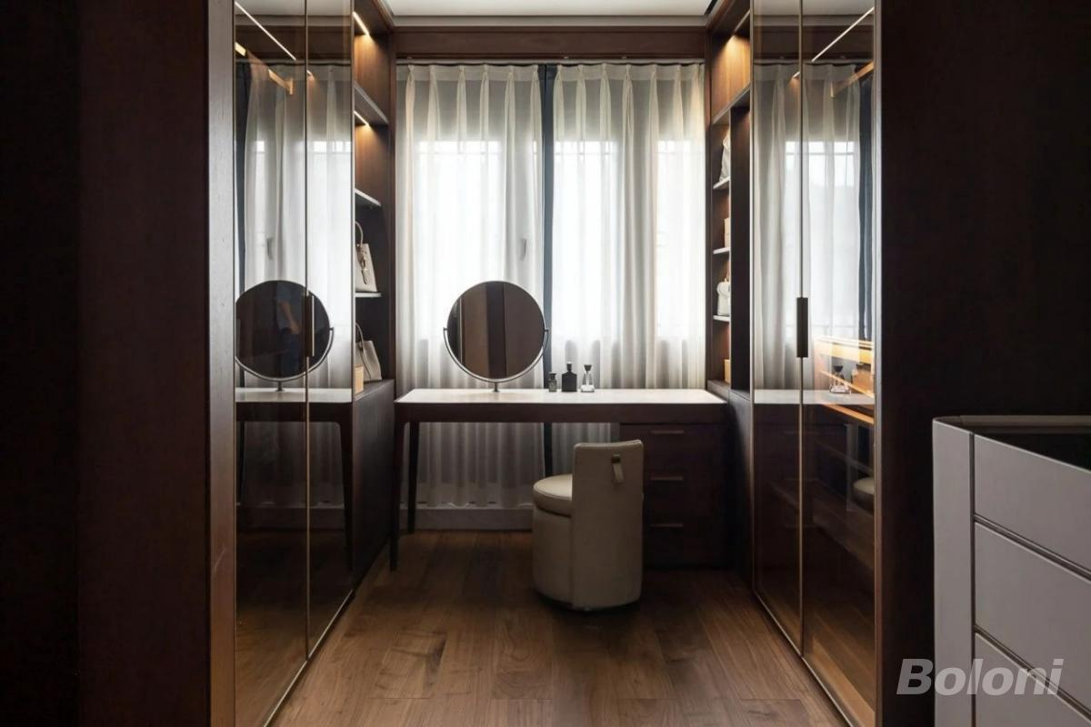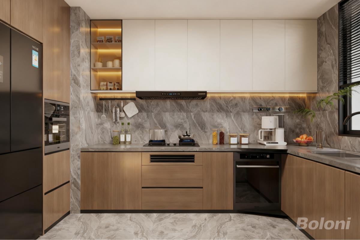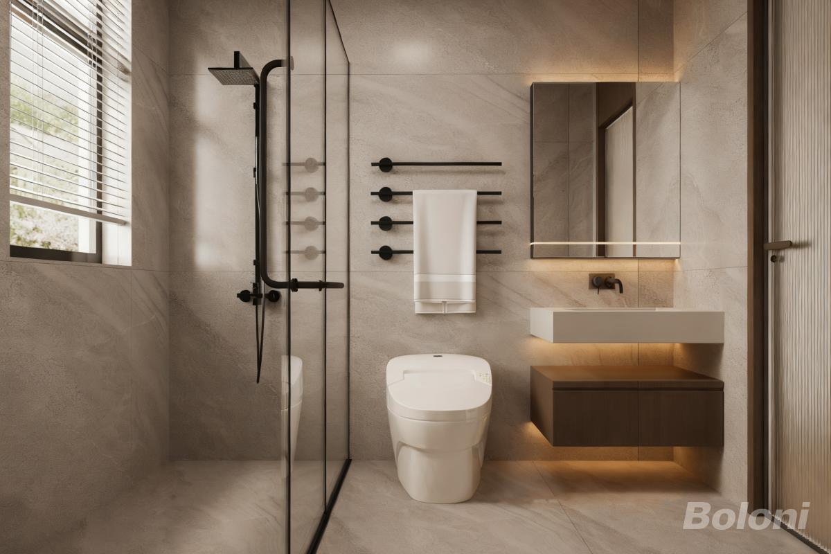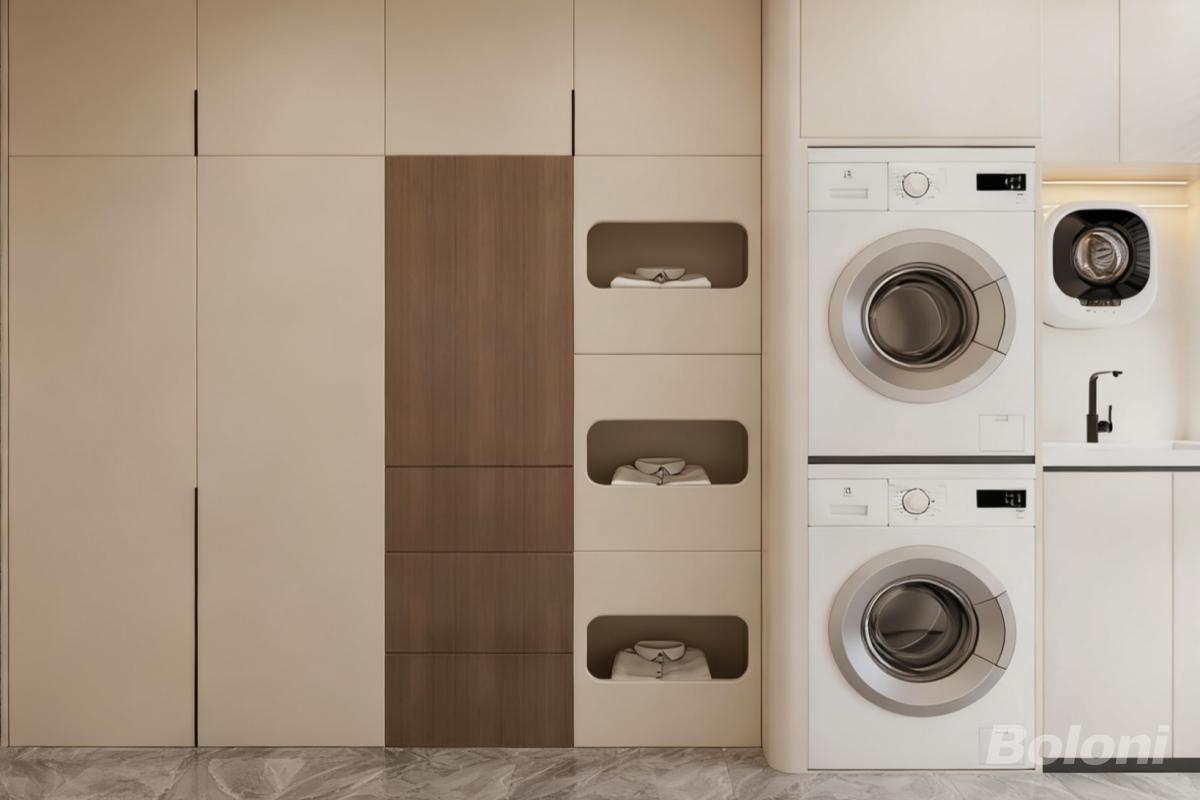 本洗衣房以浅米与木色打造简约实用空间,定制柜整合收纳与展示功能,嵌入式洗衣烘干机组节省空间,搭配水槽实现洗衣流程一体化。细节处衣物展示格与柔和灯光,让功能区兼具整洁美学,是高效且精致的家政空间。