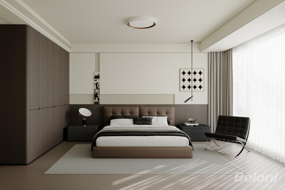 本卧室以现代简约轻奢风格营造静谧舒适的休憩空间。采用棕、白、黑配色,皮质床头与极简家具质感高级。定制衣柜满足收纳,艺术挂画与个性灯具点缀细节,光影透过纱帘营造温馨氛围,是功能与美学兼具的品质居所。
