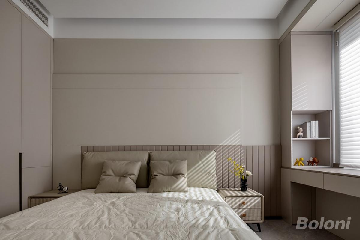 本卧室以浅咖色系打造温馨静谧的休憩空间,床头背景墙层次简约大气。一体化定制柜与书桌满足收纳与办公需求,软装细节如花艺、小摆件增添生活气息,光影透过百叶窗营造柔和氛围,是简约舒适的品质居所。