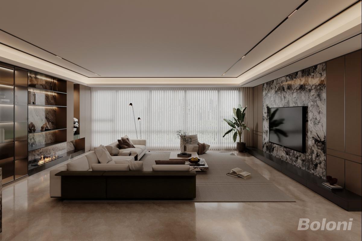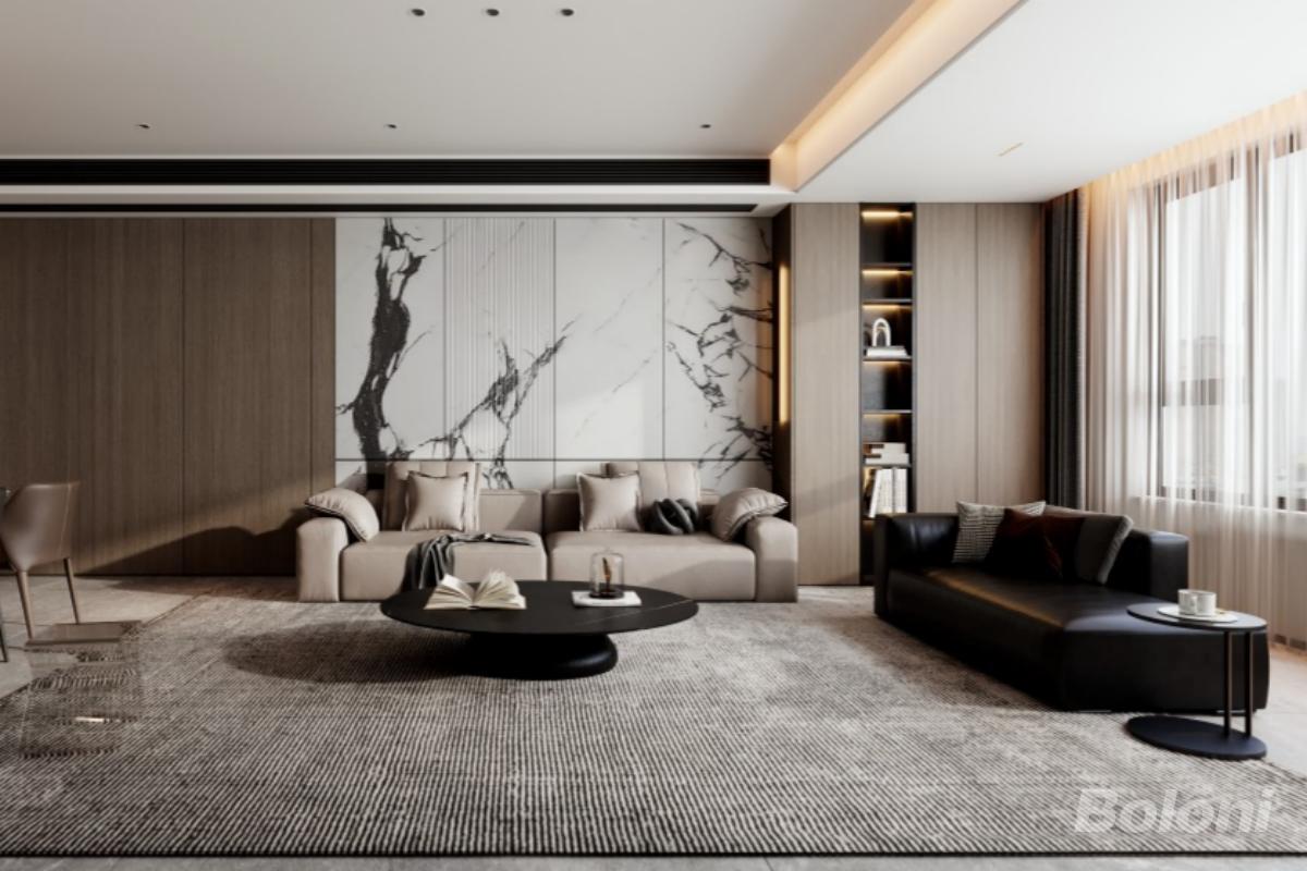 这套设计以现代轻奢风格为核心,通过材质、色彩与空间的精妙融合,打造出兼具精致感与舒适感的居住场景。整体以大地色系米色、棕色、深灰为基调,营造温暖且高级的氛围。通过黑白纹理大理石的点缀,打破单调感,增加视觉层次;黑色沙发与浅色窗帘则提升空间明亮度,让轻奢风格在沉稳中不失轻盈。