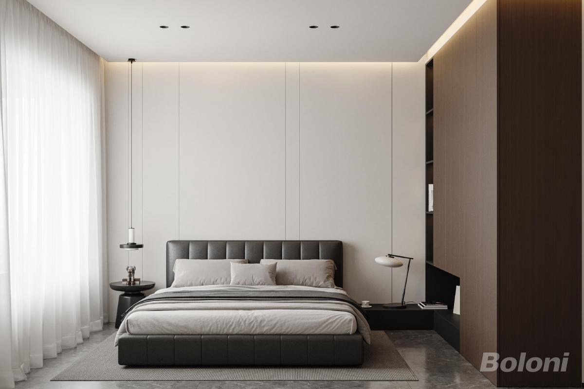 本卧室以极简轻奢风格打造静谧休憩空间。深灰皮质床具质感高级,灰白床品柔和雅致。定制木柜兼具收纳与展示,个性灯具与艺术摆件点缀细节,线性灯光与白纱帘营造温馨氛围,是简约与精致并存的品质居所。