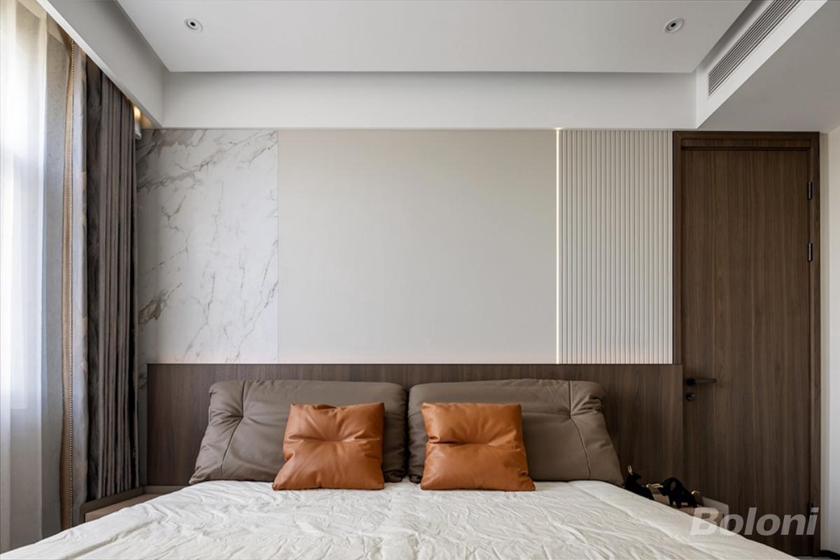 本卧室以现代简约轻奢风格打造舒适休憩空间。床头背景墙融合大理石、素色板材与格栅元素,层次丰富。棕白配色柔和雅致,皮质抱枕与小摆件点缀细节,自然光与简约灯光交织,营造出精致且放松的睡眠氛围。