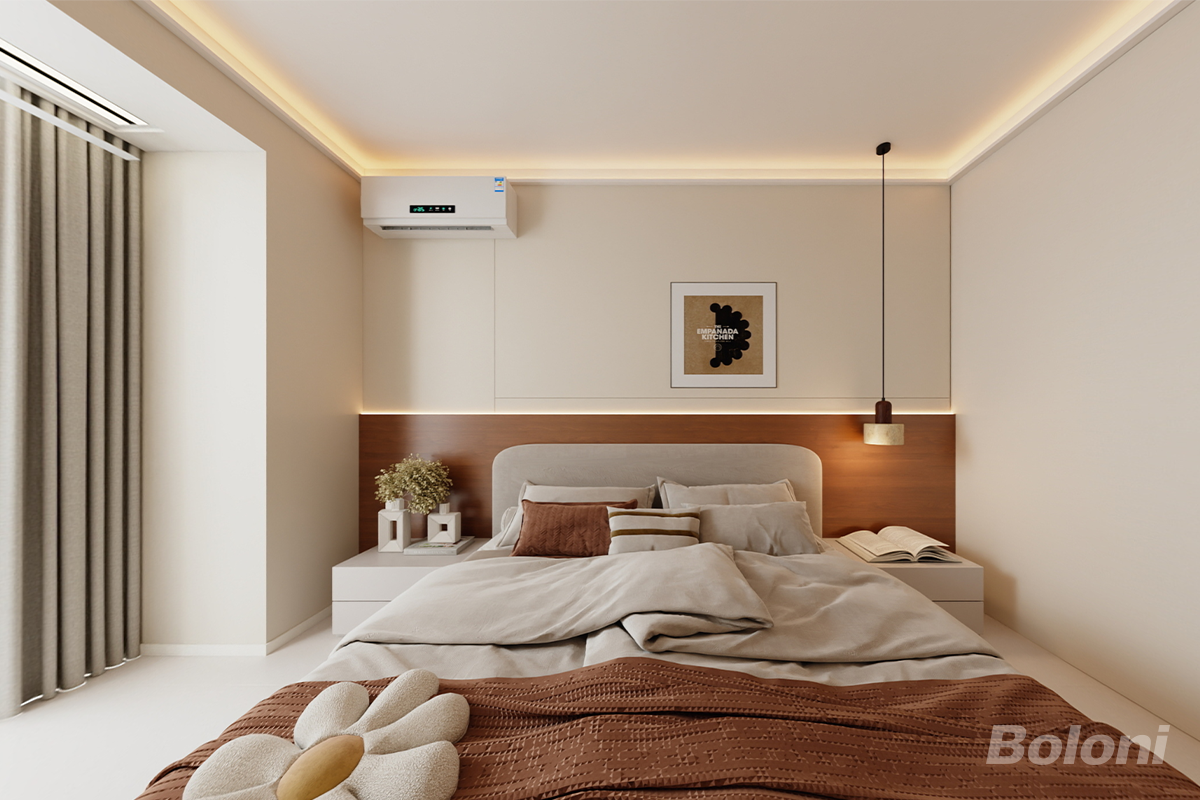 主卧作为私密的休憩空间,中古风的表达更侧重于营造静谧、舒适且充满复古情调的氛围。墙面延续了客厅的浅米色,保证了空间风格的统一性与和谐感。床头背景采用木质板材,木质的自然质感与中古风的复古韵味完美融合,为睡眠区域打造出温暖的视觉焦点。