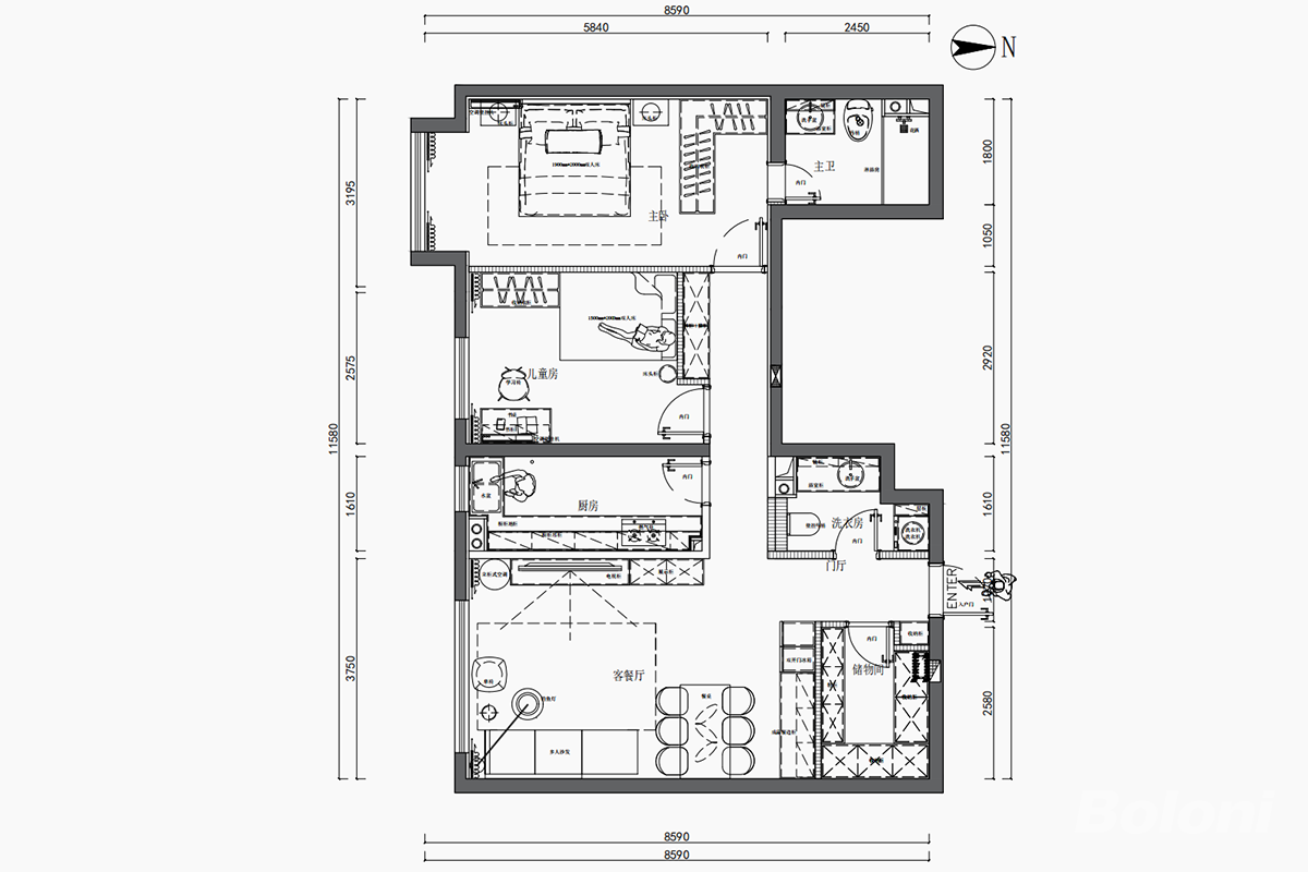 本住宅设计紧扣中古风,以营造兼具复古韵味与现代舒适的居住体验为核心。 空间色彩上,整体选用浅米色墙面搭配浅色系地面,奠定柔和、沉稳的基调,为复古元素的融入提供和谐背景。材质运用上,大量采用带有自然纹理的木质材料打造家具,如客厅的电视柜、书架和主卧的床头背景,木质的温暖质感是中古风的典型体现,传递出岁月沉淀的复古感。 装饰细节处处彰显中古风,客厅与主卧的装饰画,或展现悠远意境,或具鲜明艺术感,似复古时光的艺术印记;灯具设计独特,客厅吊灯结合金属与玻璃材质,主卧床头吊灯简约有设计感,金属光泽与柔和灯光营造出复古又温馨的氛围;床上用品选取浅棕、米色等大地色系并搭配复古纹理织物,从色彩与质感上呼应。