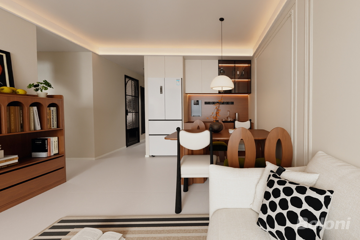 这处中古风客餐厨一体化空间,以暖棕、米白为基调,通过浅木书架、复古 “O 型” 餐椅、黑框玻璃门等元素,融合复古材质与经典家具,在客、餐、厨连贯的动线布局中,实现了中古风格的复古韵味与现代居住功能的平衡,营造出温馨且具质感的生活场景。
