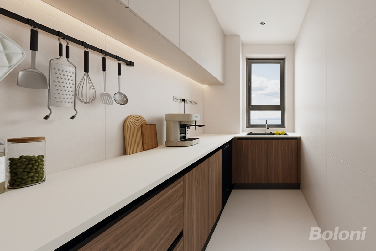 以浅色调为基底,营造出明亮清爽的氛围。木质橱柜带着自然纹理,尽显复古的温润质感,搭配简洁的白色台面,和谐又雅致。墙面挂着的厨具,简约中透着实用,与整体风格相呼应。窗边的布置,让自然光线充分进入,为厨房增添了一份复古与清新交融的独特韵味,既方便烹饪操作,又充满生活气息。