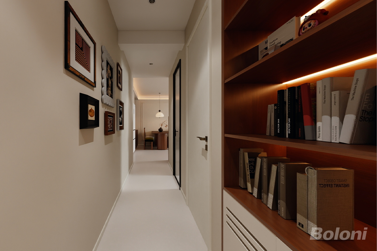 以米白墙面为基底,左侧墙面错落悬挂多幅复古装饰画,框型与画面风格各异,营造出艺术感十足的中古视觉层次;右侧深木色书柜嵌入线性灯带,陈列的书籍与复古摆件在暖光下尽显质感,尽头餐厨区的复古吊灯若隐若现,整体通过材质、软装与光影的搭配,将中古风格的复古韵味与空间延伸感巧妙融合,打造出兼具艺术氛围与复古温度的过渡空间。