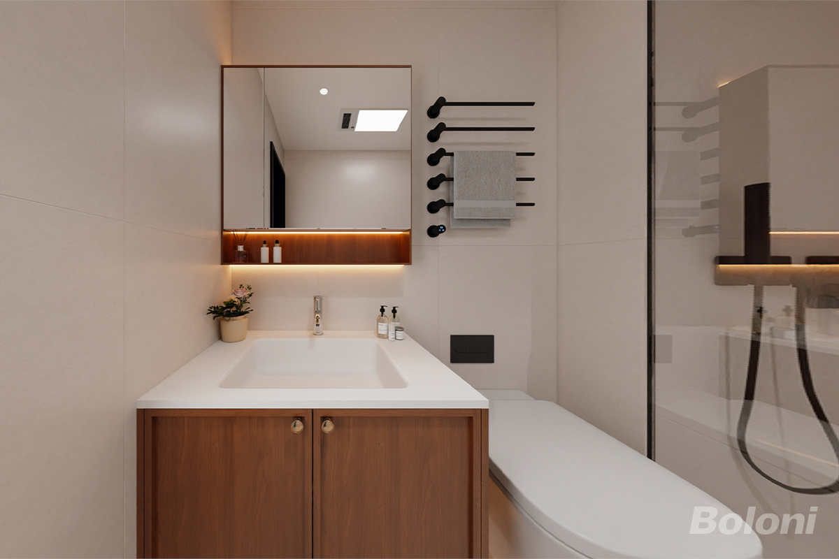以浅色调为主营造出明亮干净的氛围。木质的浴室柜,带着自然的纹理与温润质感,搭配复古风格的金属拉手,尽显中古风的雅致;镜柜下方的木质置物区,辅以暖光照明,既实用又增添了复古韵味。同时,现代感的卫浴设施与中古风元素相融合,让浴室在具备便捷使用功能的同时,也散发着复古与时尚兼具的独特气息。