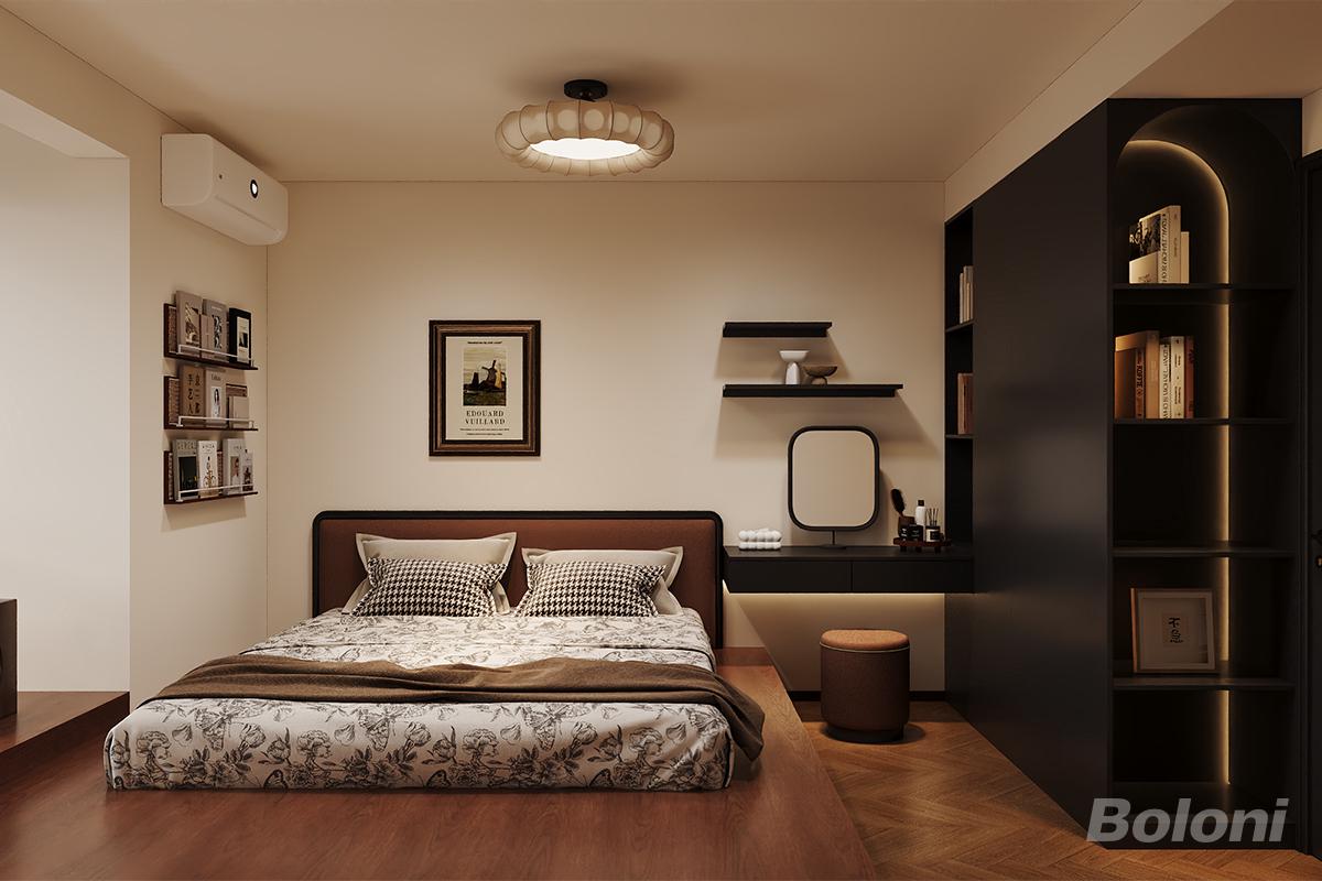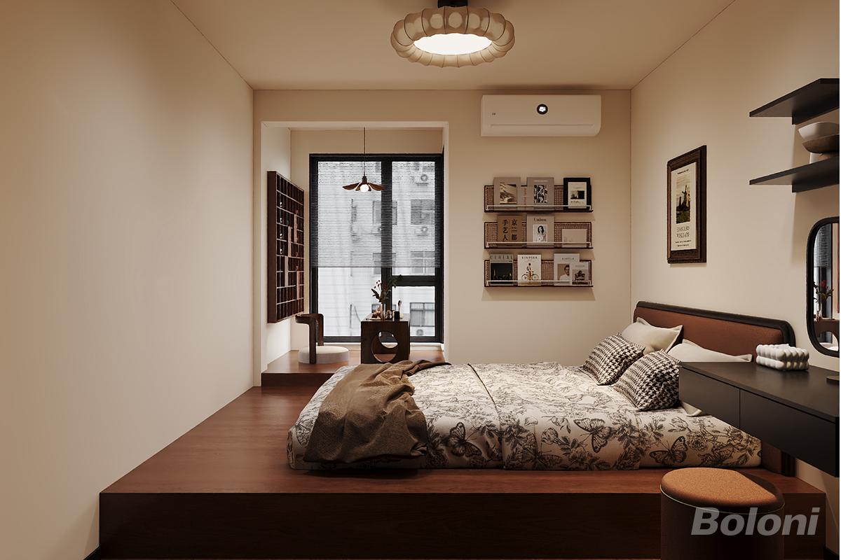 以“东方禅静+实用美学”为核心,将地台的低矮通透与中古风的木作肌理、简雅韵味融合,打造兼具休憩、储物、氛围营造的主卧核心区域,延续全屋东方意蕴的同时适配现代睡眠需求。
