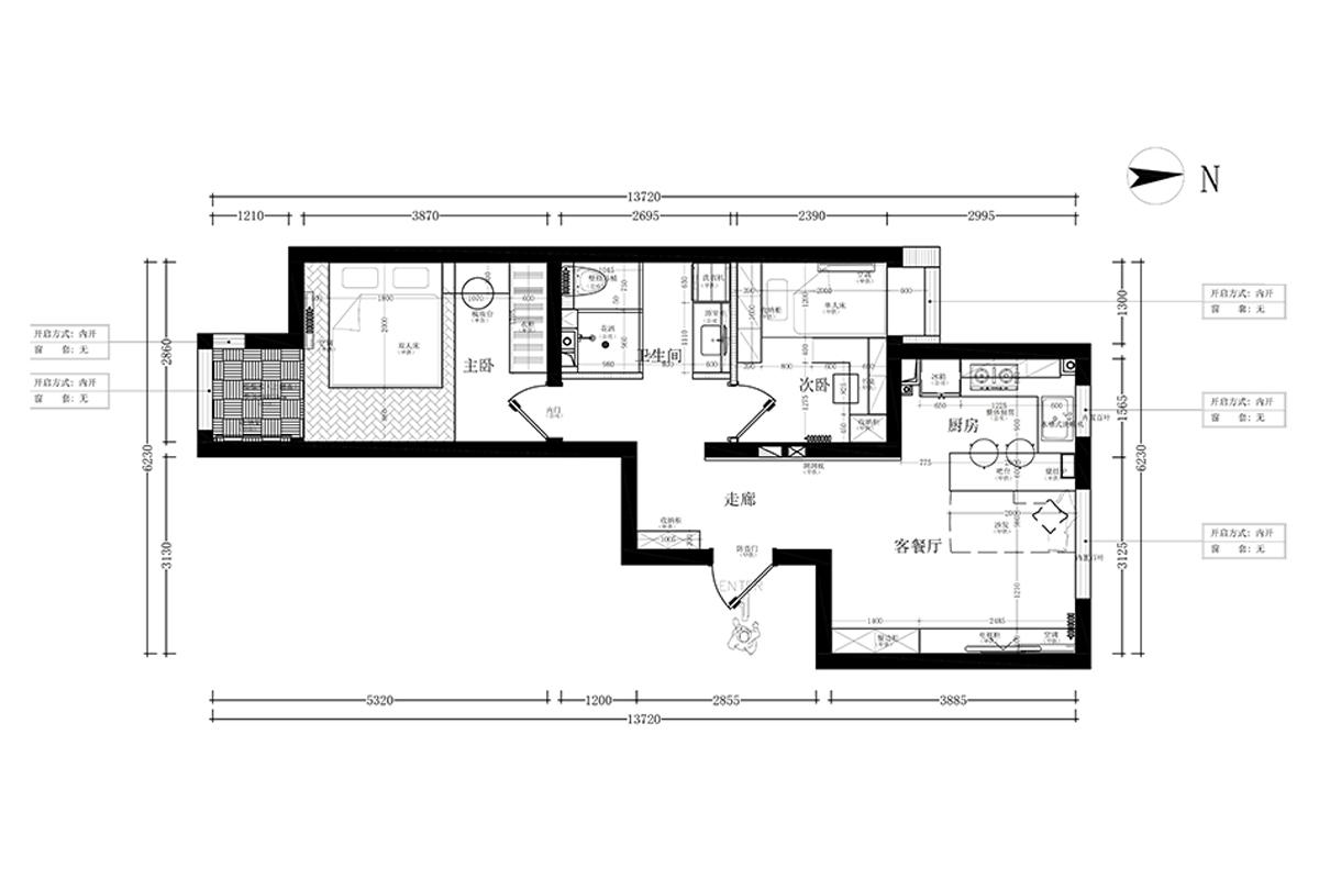 拆除厨房与客厅之间的非承重隔墙,形成“L型厨房+客餐一体化”布局,厨房沿墙面设置操作台,预留≥1.2m的烹饪动线,客厅与厨房之间用岛台、吧台或地面材质划分功能区,不影响通透感